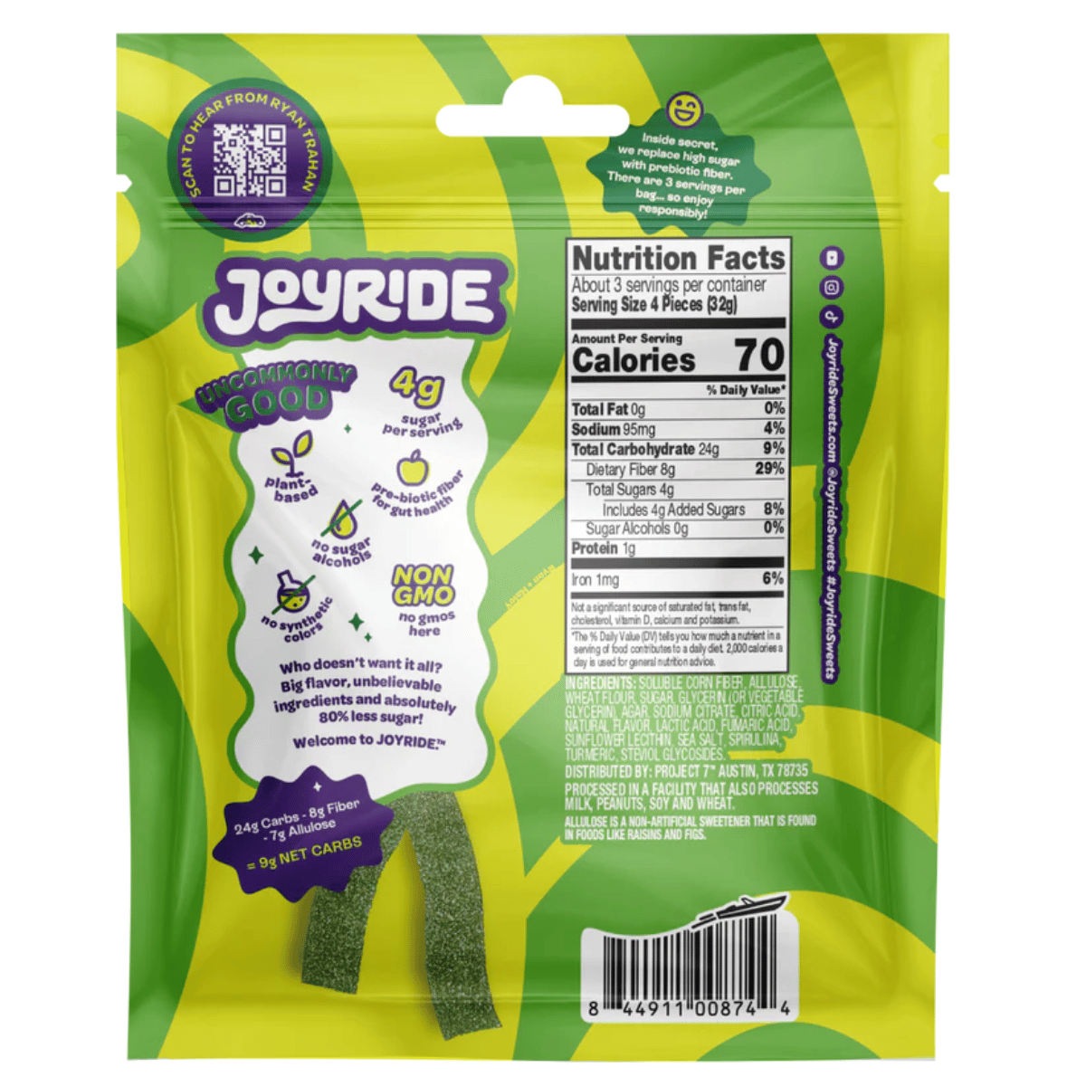 With a ready-to-go 2 pack, you can double down on vegan green apple strip candy goodness while keeping your snacks low in sugar. Joyride Sour Green Apple Strips are tart, stretchy, and built for snacking with less sugar and more flavour.