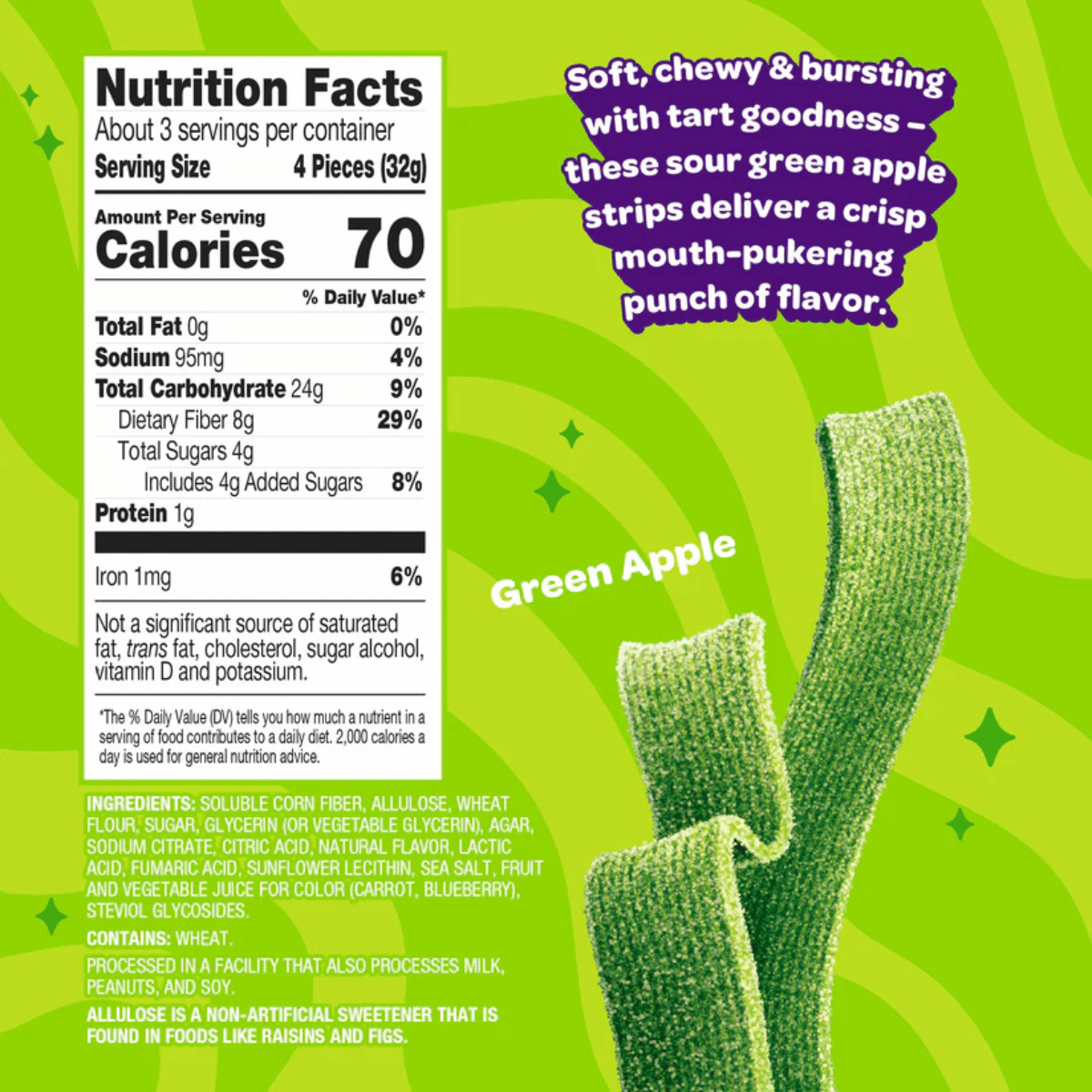 These plant-based sour apple candy strips stretch & pull like the full sugar version, but deliver just 4 grams of sugar per serving without any artificial dyes or refined sugars. Bright, tangy, and ready to crush all of your candy cravings. Perfect for those long car rides, movie nights, or stashing in your candy drawer for when lower sugar candy cravings hit.