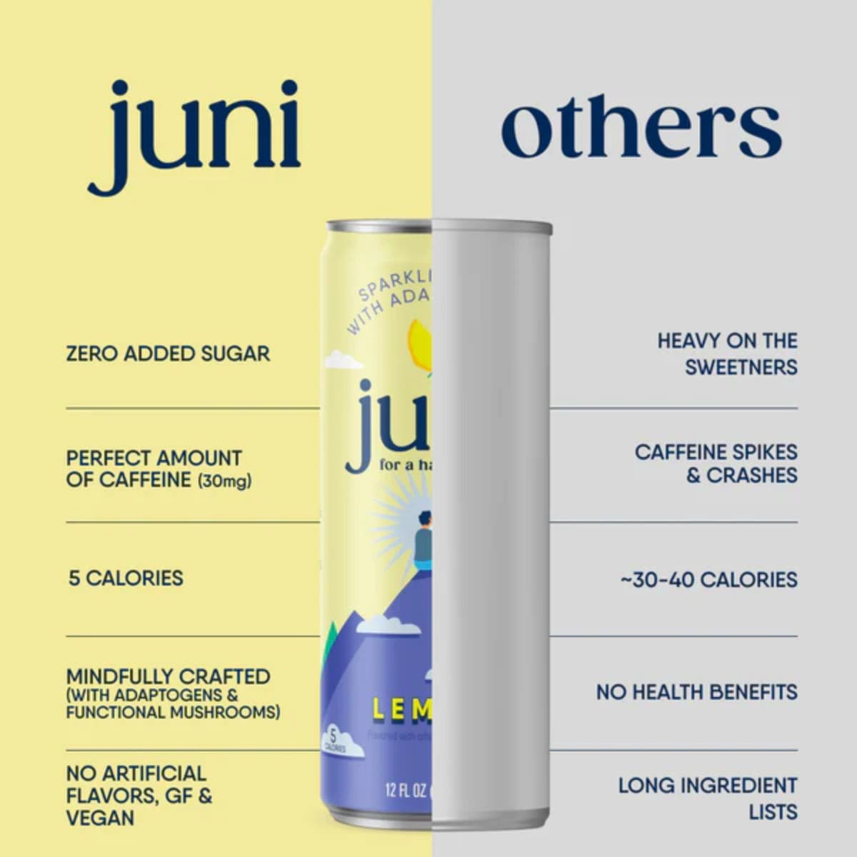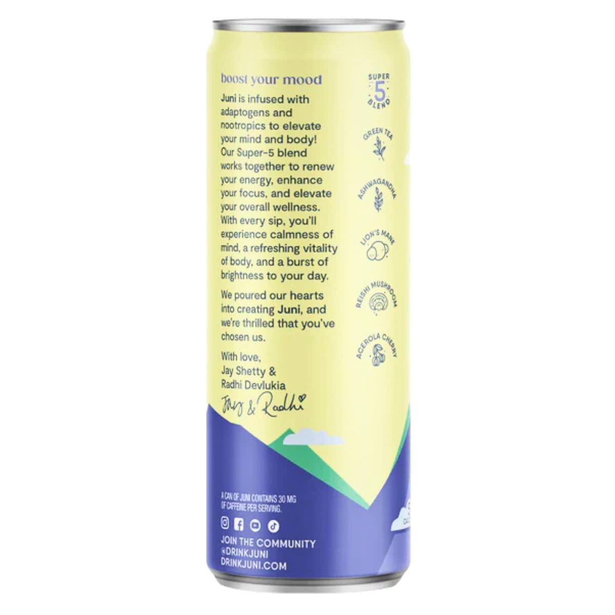 That means that while you enjoy the lemony fizz, the organically-derived adaptogens and nootropics in Juni Sparkling Adaptogenic Tea Lemon will help sharpen your mind, help reduce mental and physical stress, and boost your memory and focus. Pretty impressive for one little can, right?