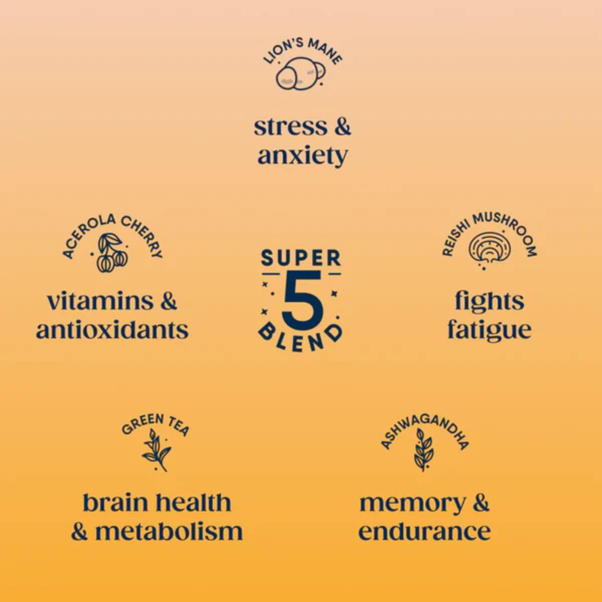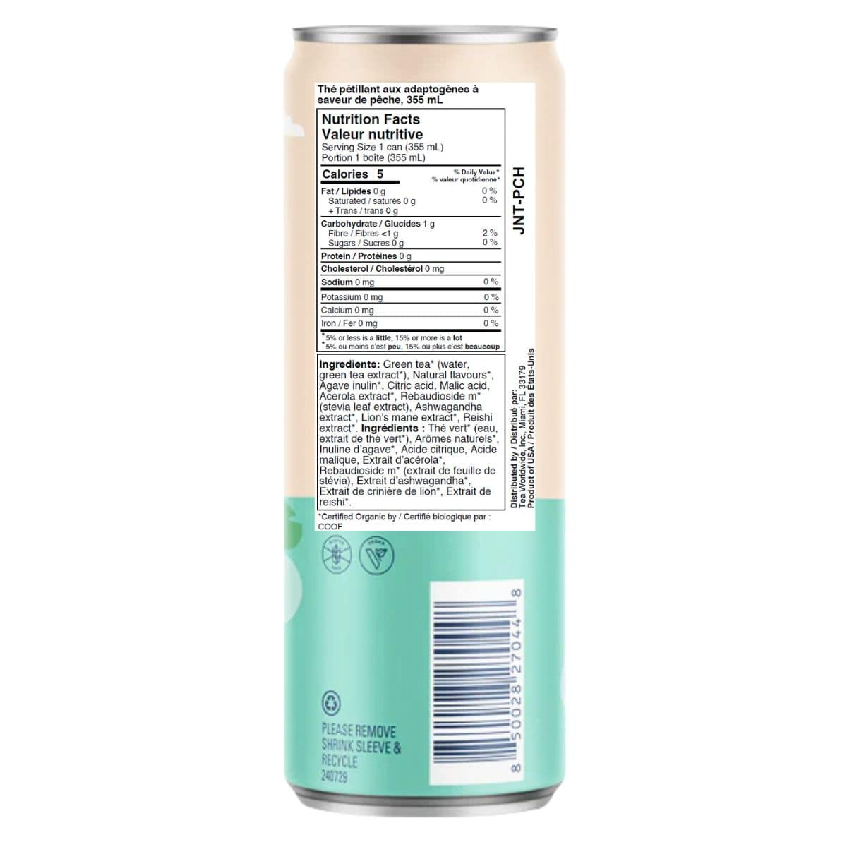 Organic green tea (water, organic green tea extract), Organic natural flavours, Organic agave inulin, Citric acid, Malic acid, Organic acerola extract, Organic rebaudioside m (stevia leaf extract), Organic ashwagandha extract, Organic lion's mane extract, Organic reishi extract.
