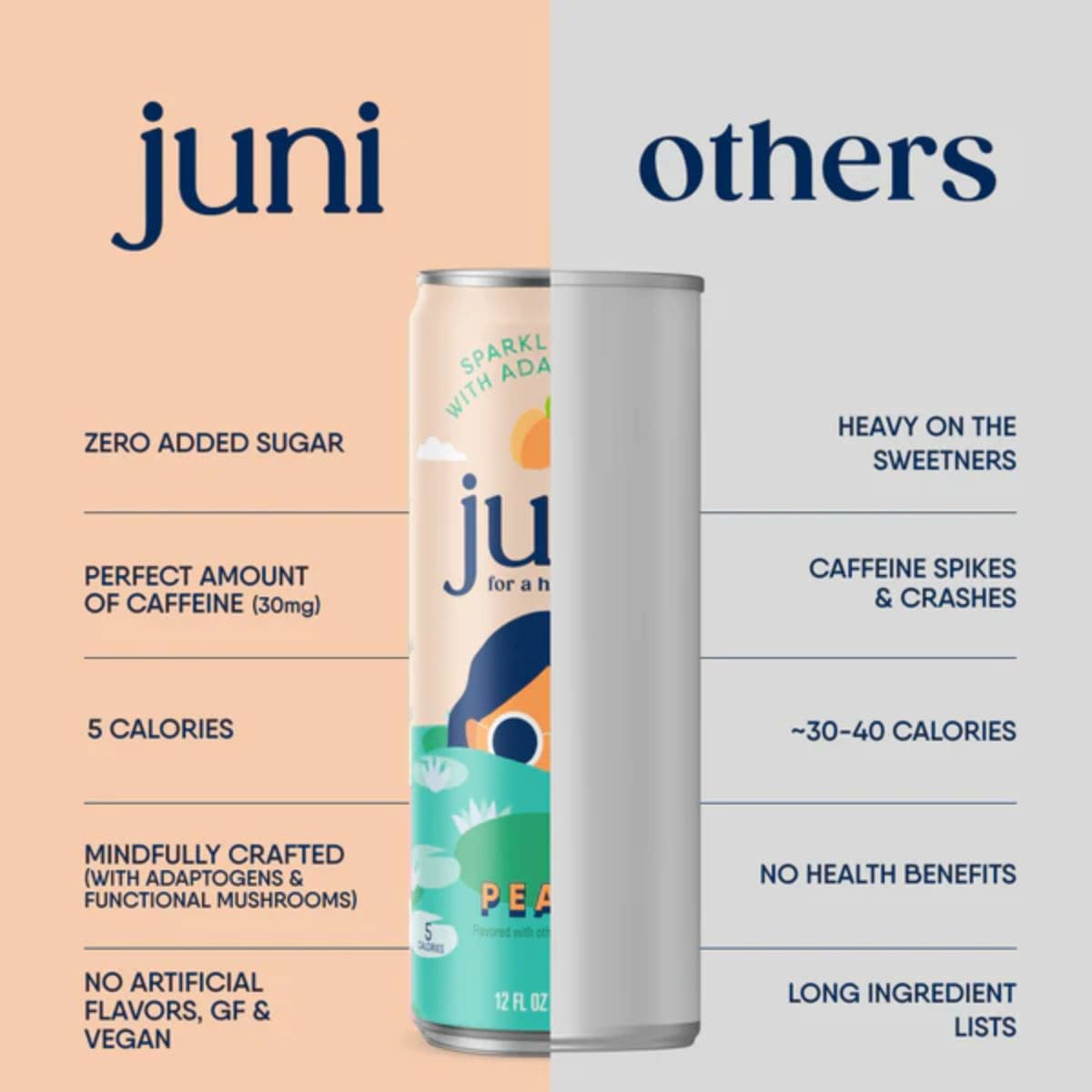And we’re not kidding. Thanks to the organic adaptogens and nootropics in Juni Sparkling Adaptogenic Tea Peach, each bubbly sip will help you clear your mind of brain fog, help your body cope with stress, and sharpen your memory and focus - the all natural way. All this, packaged in a delicious peachy taste you’ll love!