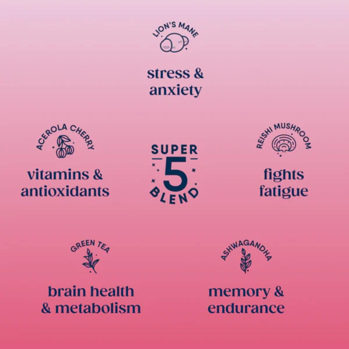 Organic green tea (water, organic green tea extract), Organic natural flavours, Organic agave inulin, Citric acid, Malic acid, Organic acerola extract, Organic rebaudioside m (stevia leaf extract), Organic ashwagandha extract, Organic lion's mane extract, Organic reishi extract.