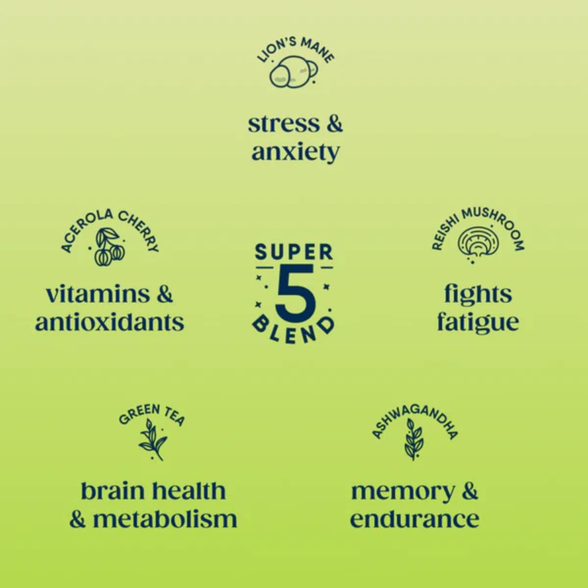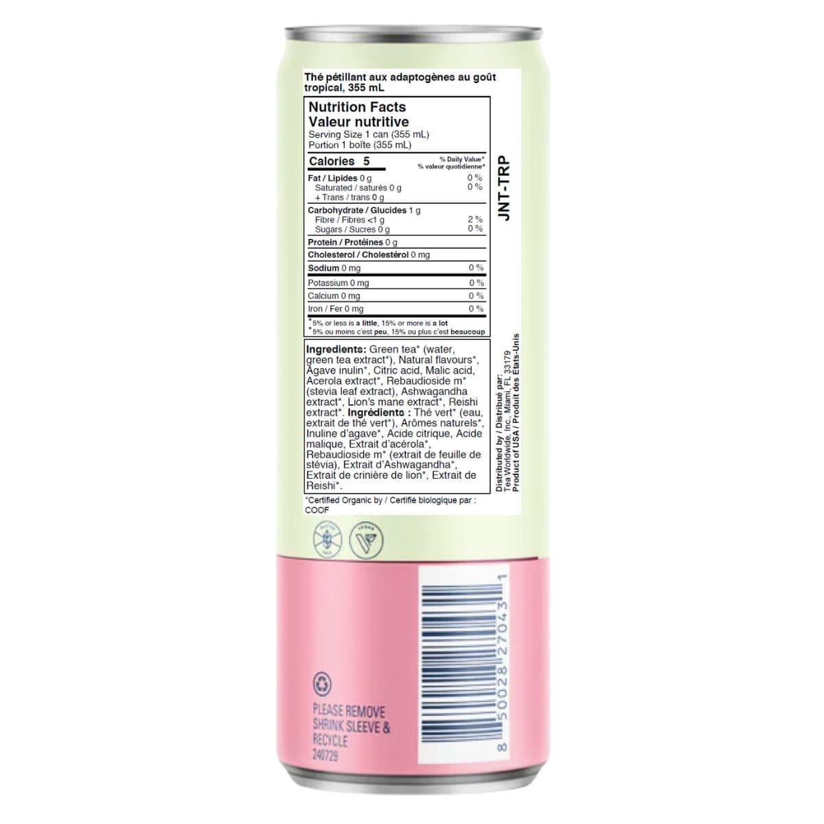 Organic green tea (water, organic green tea extract), Organic natural flavours, Organic agave inulin, Citric acid, Malic acid, Organic acerola extract, Organic rebaudioside m (stevia leaf extract), Organic ashwagandha extract, Organic lion's mane extract, Organic reishi extract.