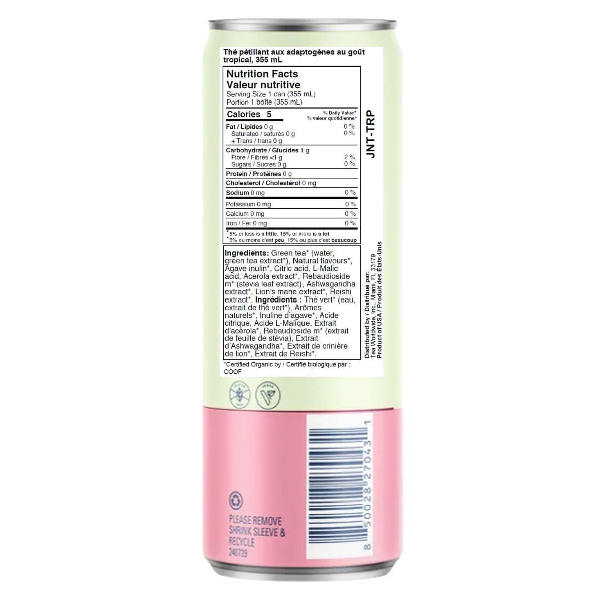 Organic green tea (water, organic green tea extract), Organic natural flavours, Organic agave inulin, Citric acid, L-Malic acid, Organic acerola extract, Organic rebaudioside m (stevia leaf extract), Organic ashwagandha extract, Organic lion's mane extract, Organic reishi extract.
