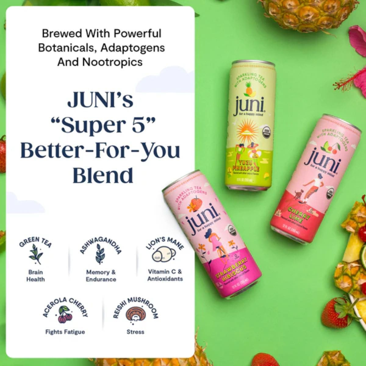 Carbonated water, Organic natural flavours, Citric acid, Organic hibiscus extract, Organic agave inulin, Organic acerola extract, L-malic acid, Organic rebaudioside m (stevia leaf extract), Organic ashwagandha extract, Organic lion's mane extract, Organic reishi extract.