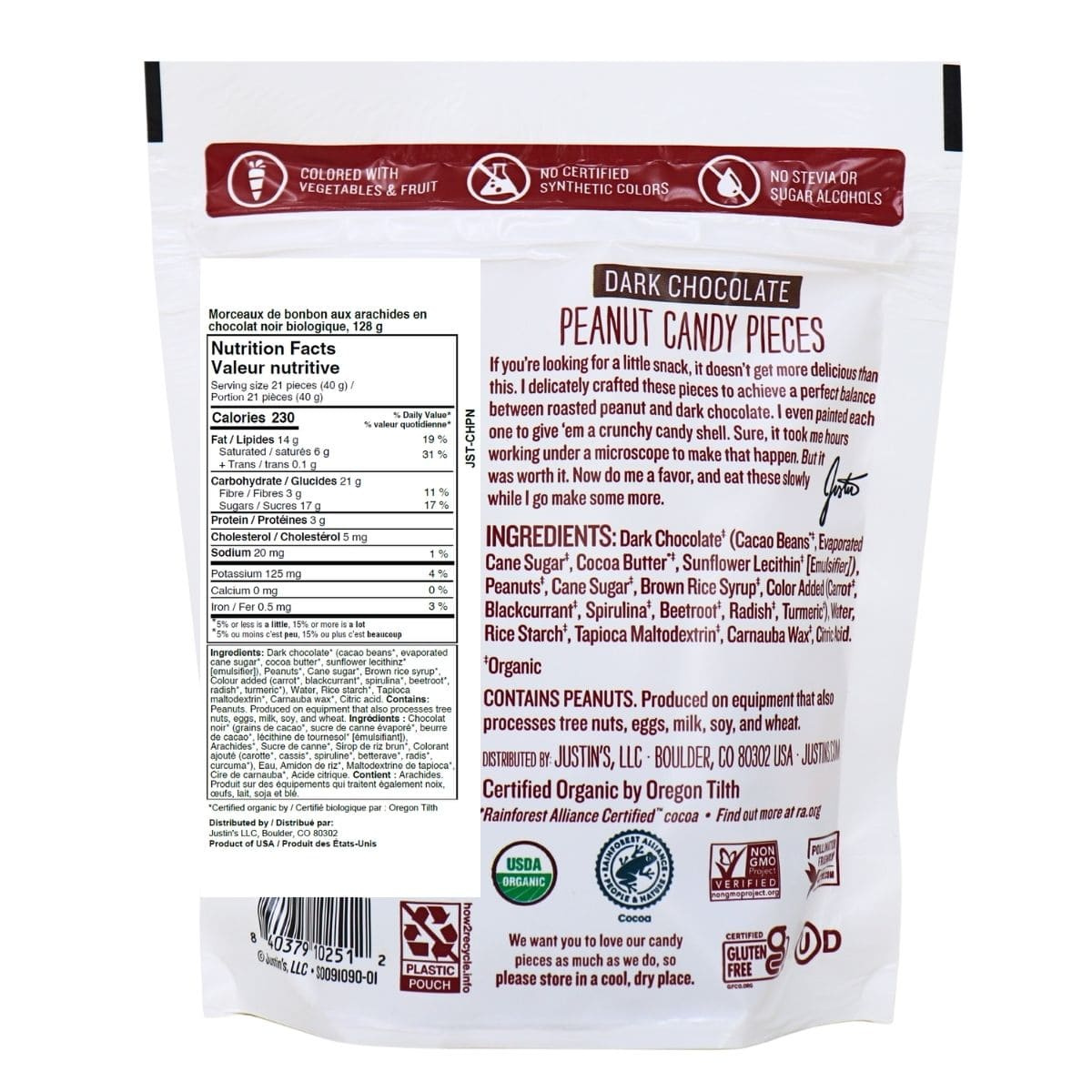 Crunchy AND creamy. Justin’s dark chocolate peanut candy pieces have everything you’re looking for in a bite-sized treat. From the satisfying crunch of the candy shell to the creamy, melt-in-your-mouth dark chocolate, and the irresistible roasted peanut center, it's a triple threat of yumminess! And their vibrant bright colours? They’re all-natural! Coloured with real fruits and vegetables, these chocolate peanut candies are made with simple organic ingredients for a rollercoaster of yum that you won't want to get off! Trust us, once you try Justin's, you'll never want to go back!