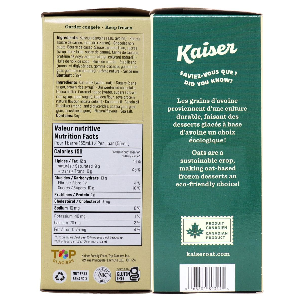 Caramel sweetness and creamy vanilla blend together in these oat-based frozen dessert bars dipped in smooth vegan chocolate. Kaiser Salted Caramel Vegan Frozen Dessert Bars swirl a creamy vanilla centre with caramel for warm sweetness and a touch of salt that settles softly in every bite.Â