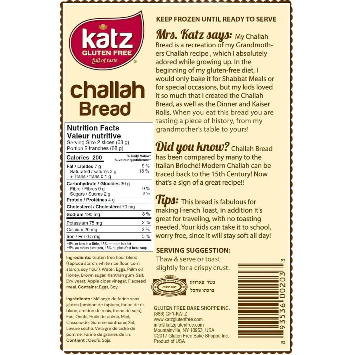 Challah-lujah! Katz gluten-free challah bread is here to make your meals better. Soft, fluffy and ready for anything. This bread is perfect for sandwiches, toast and even grandma’s secret recipes. Gluten-free, dairy-free, nut-free and bursting with flavour! Every slice is a ticket to culinary celebration. Spread, dip or soak, the possibilities are endless! Go ahead. Break bread and enjoy the slice of life!