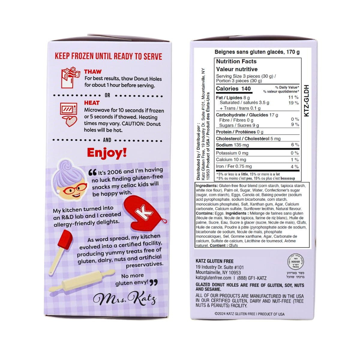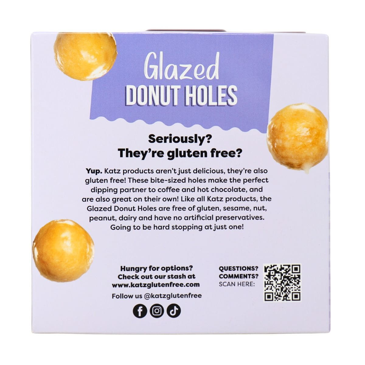Get ready to enter a ‘hole’ new world of gluten-free goodness with Katz’s gluten-free donut holes! Soft, pillowy, and glazed to sweet, sweet perfection, these bite-sized donut holes are a hole-in-one! Made without any dairy, soy, or nuts, whether you pop 'em in your mouth one by one or share the hole-some goodness, life is a ‘hole’ lot sweeter with Katz!