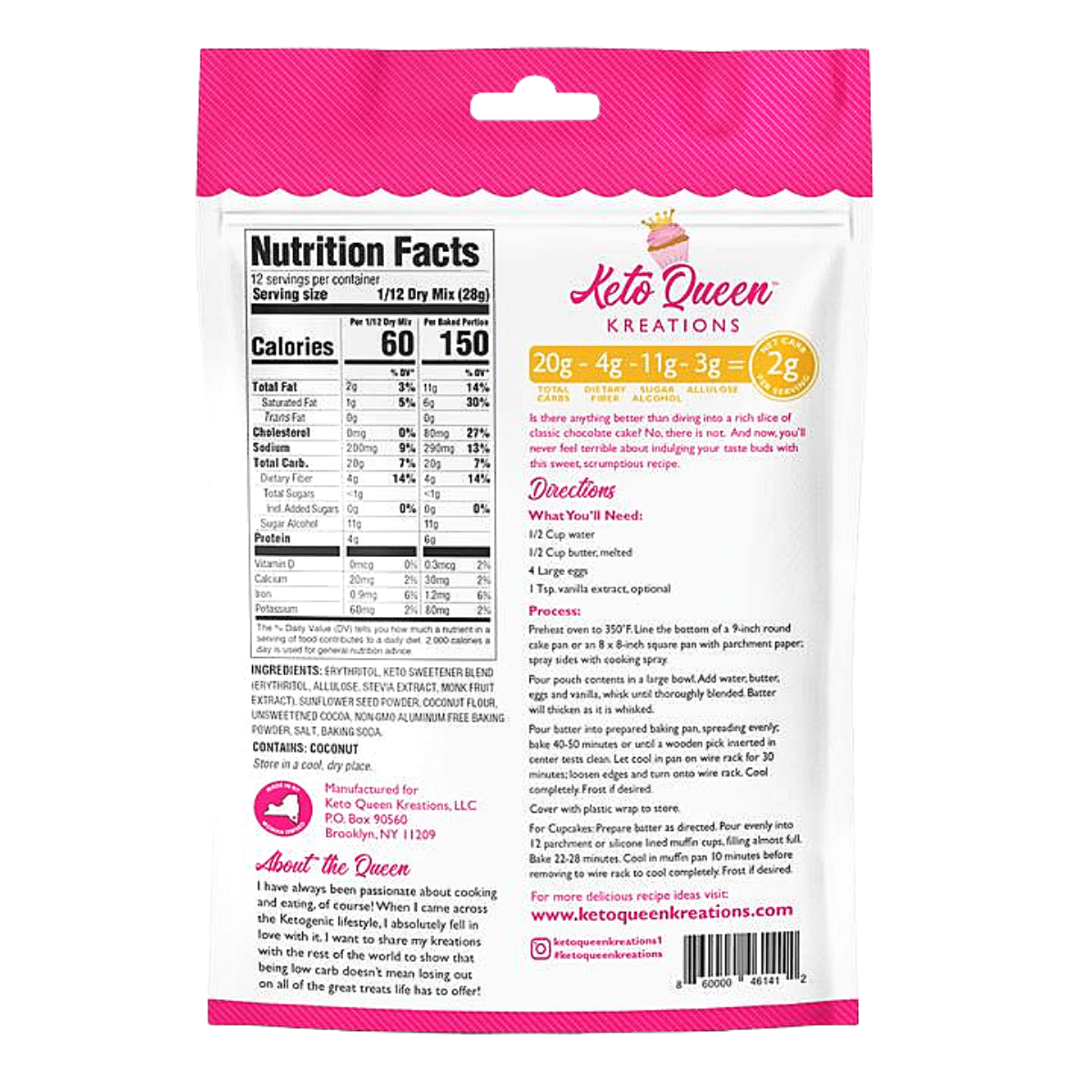 Keto Queen Kreations presents their Chocolate Cake mix! Keto lovers rejoice, this only has 1g Net Carbs per serving! You’ve never been this excited to make cake before. Sugar, Dairy, Nut and Gluten-Free, and made with only 5 simple ingredients! Chocolate cake has never been this simple, delicious, or low carb! And get this, the mix is vegan! Use with your standard replacements for animal products, to make a delicious vegan dessert!