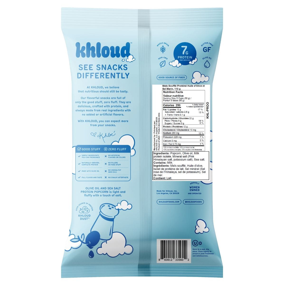 High-protein snacks don’t have to be dry, dense, or disappointing, and Khloud’s Olive Oil & Sea Salt Popcorn is proof.