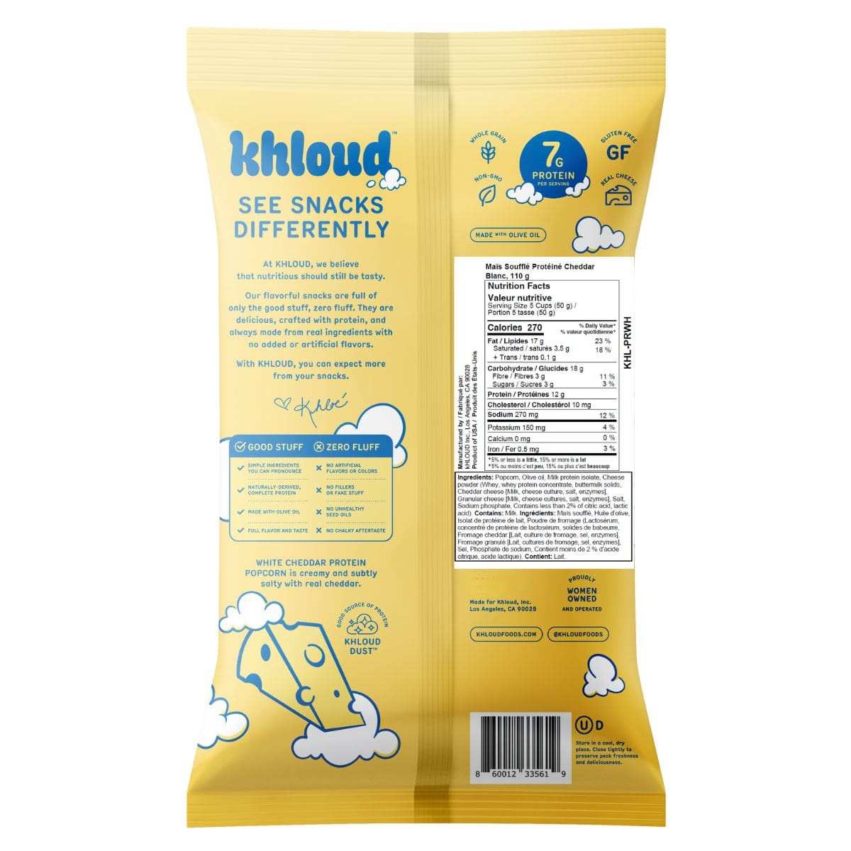 Khloud’s White Cheddar Protein Popcorn is Khloé’s answer to your savoury snack cravings. It starts with air-popped corn grown in Nebraska, tossed with rich white cheddar flavour, a drizzle of olive oil, real cheddar cheese, and finished with a sprinkle of sea salt. It’s ready to satisfy all of your crunchy salty cravings, with no seed oils or filler ingredients in sight.