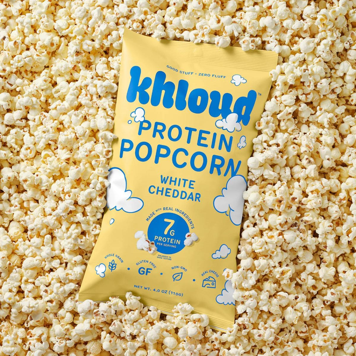 Each serving is dusted with Khloud Dust, a milk protein isolate blend that delivers 12g of complete protein per serving. No powdery residue. No strange aftertaste. Just real cheesy popcorn that delivers flavour and function in one seriously craveable bite.