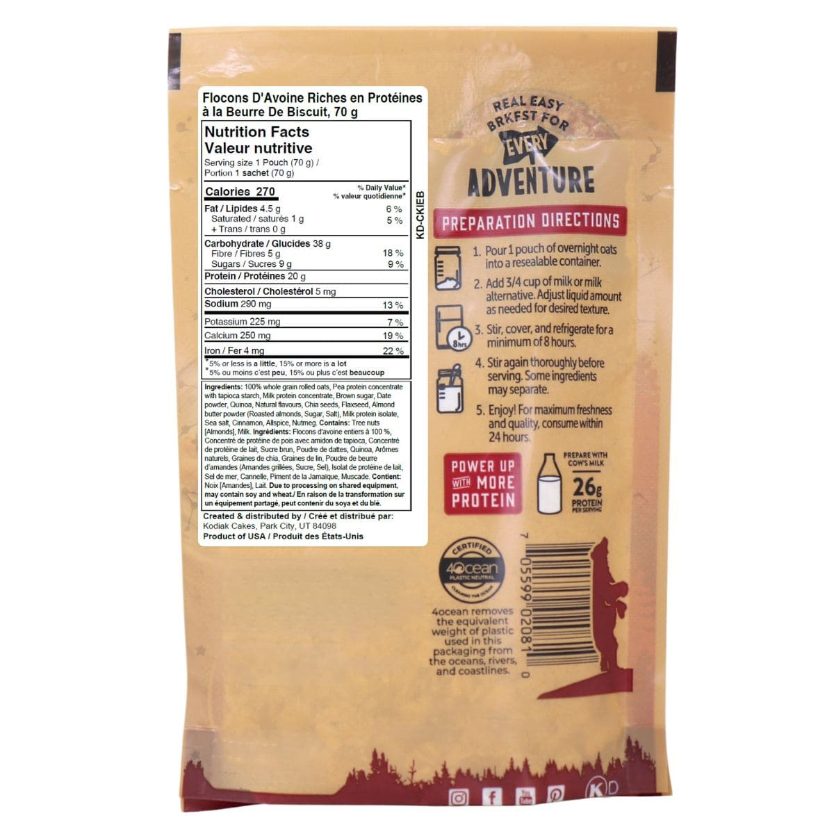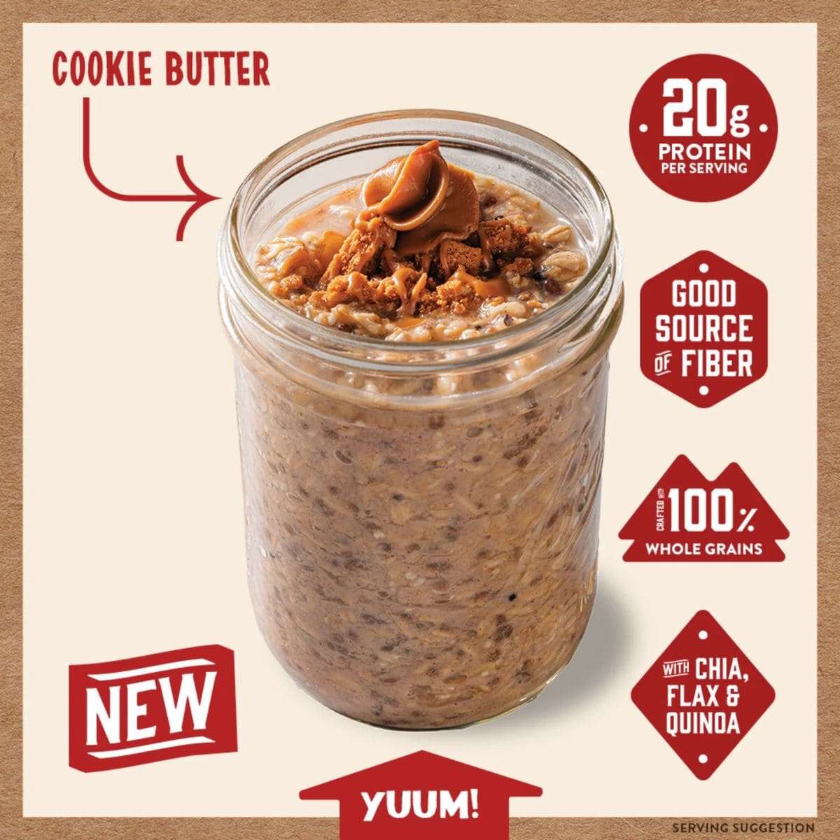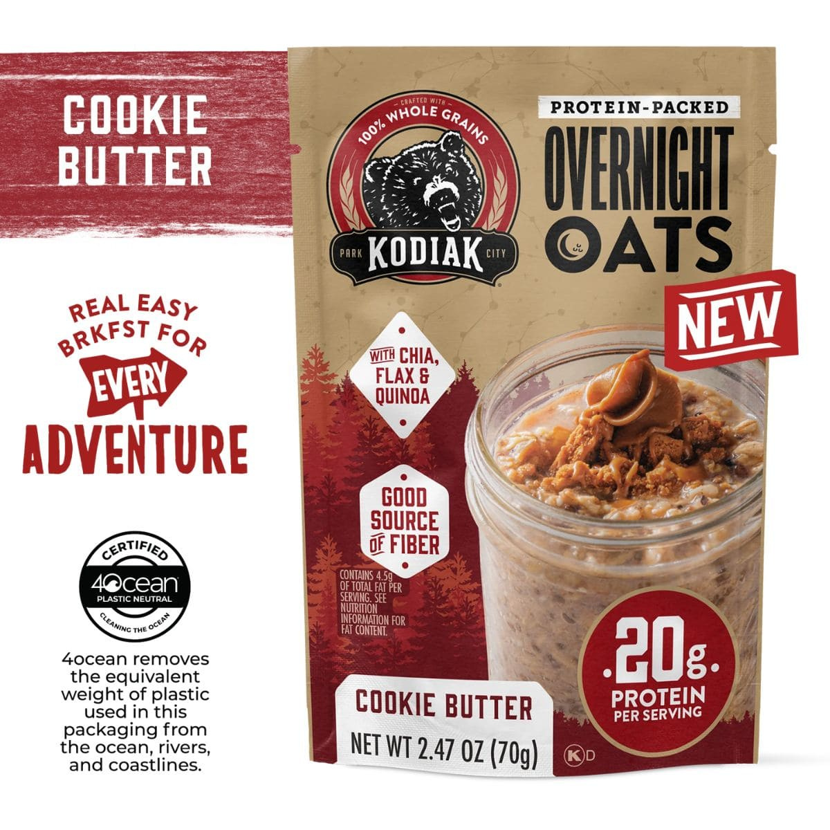Warm cookie-butter comfort, in a spoonable, chill-from-the-fridge breakfast. Kodiak Overnight Oats Cookie Butter brings that sweet, spiced cookie vibe into a protein-packed oats base that feels filling and satisfying. Made with 100% whole grains, it delivers 20 g of protein per serving to help keep you going through busy mornings.