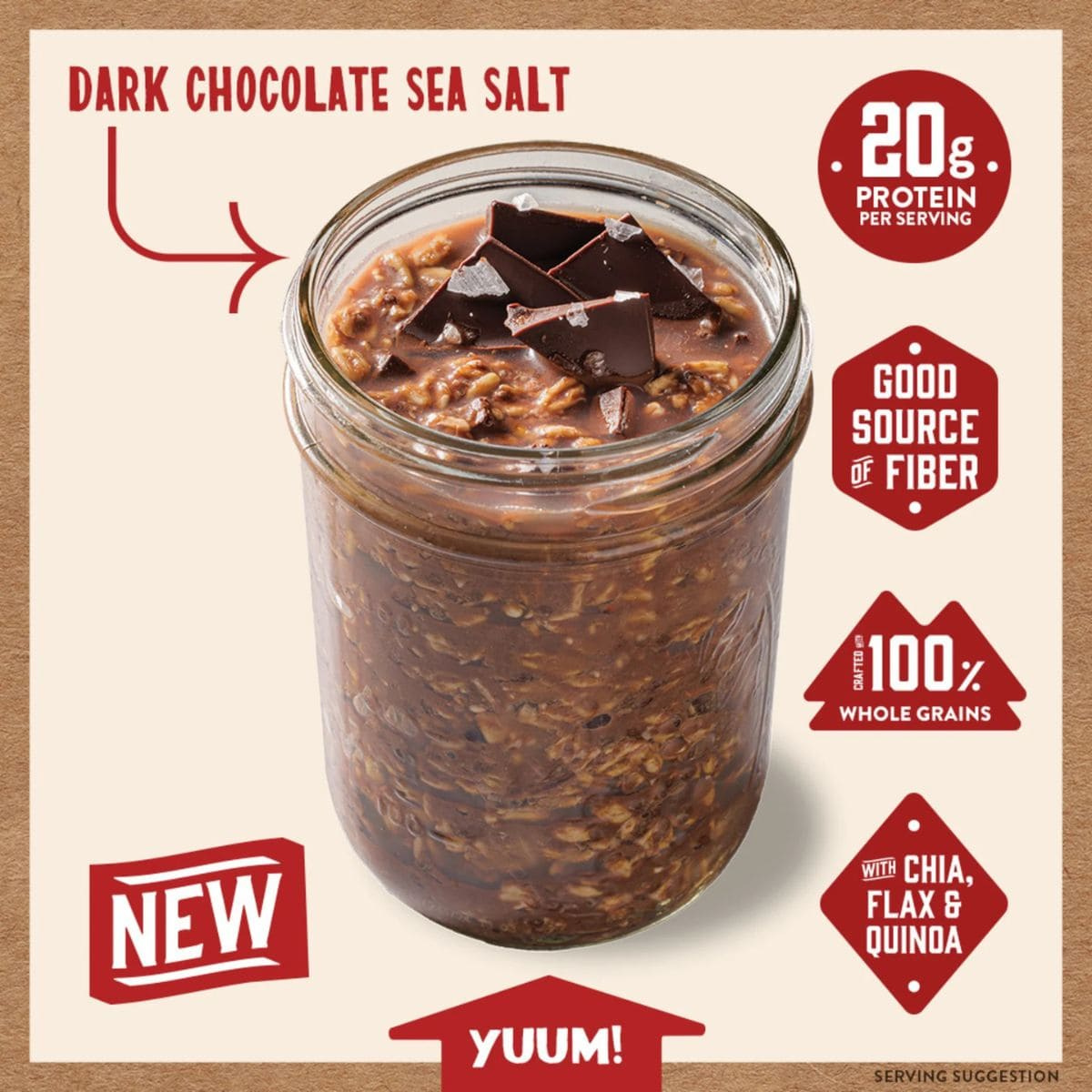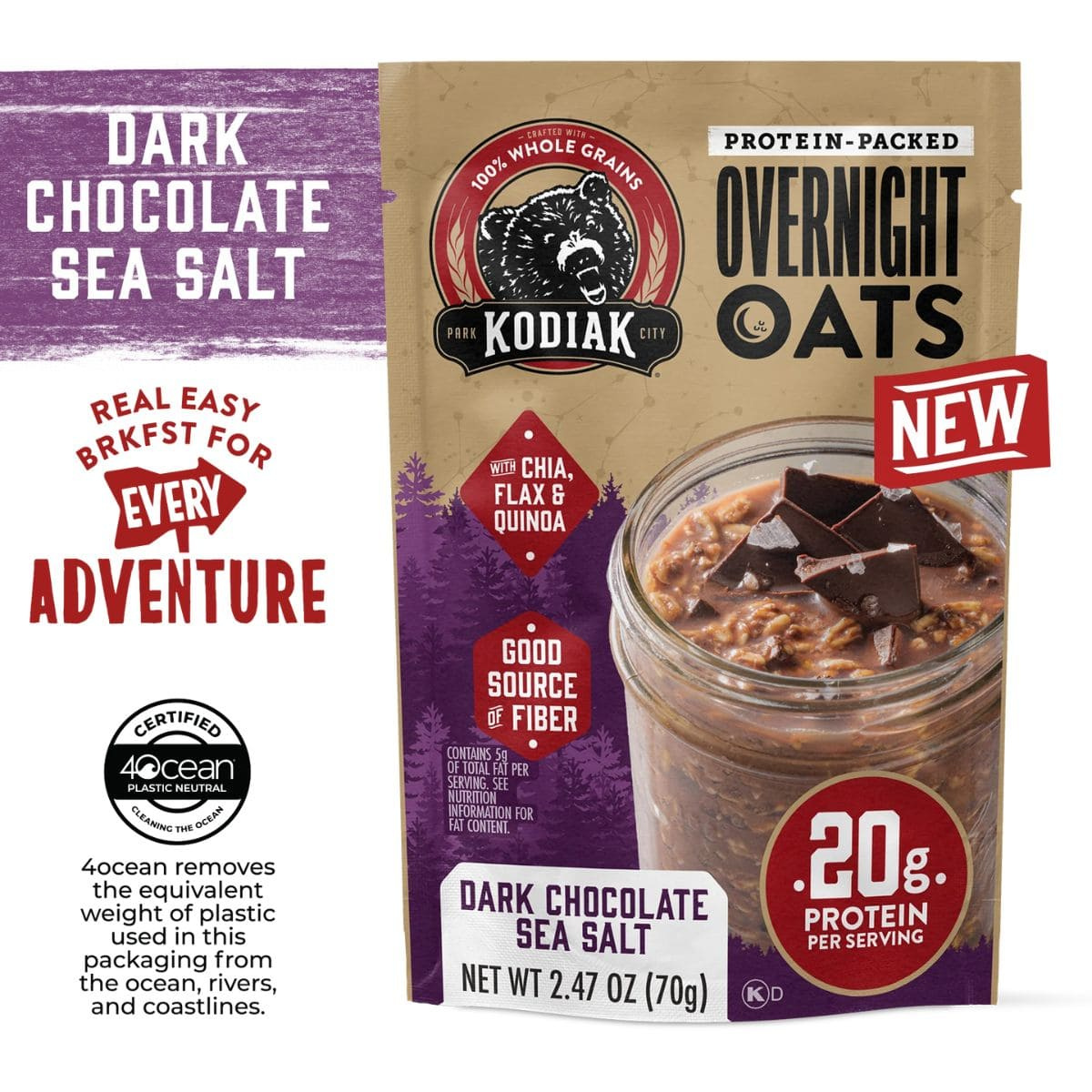 Chocolatey, cozy, and just salty enough to keep you coming back for another bite. Kodiak Dark Chocolate Sea Salt Overnight Oats brings a rich cocoa vibe with a subtle sea salt finish that makes it taste like a treat, not a compromise. It’s made with 100% whole grains and delivers 20 g of protein per serving for a breakfast that actually holds you over.
