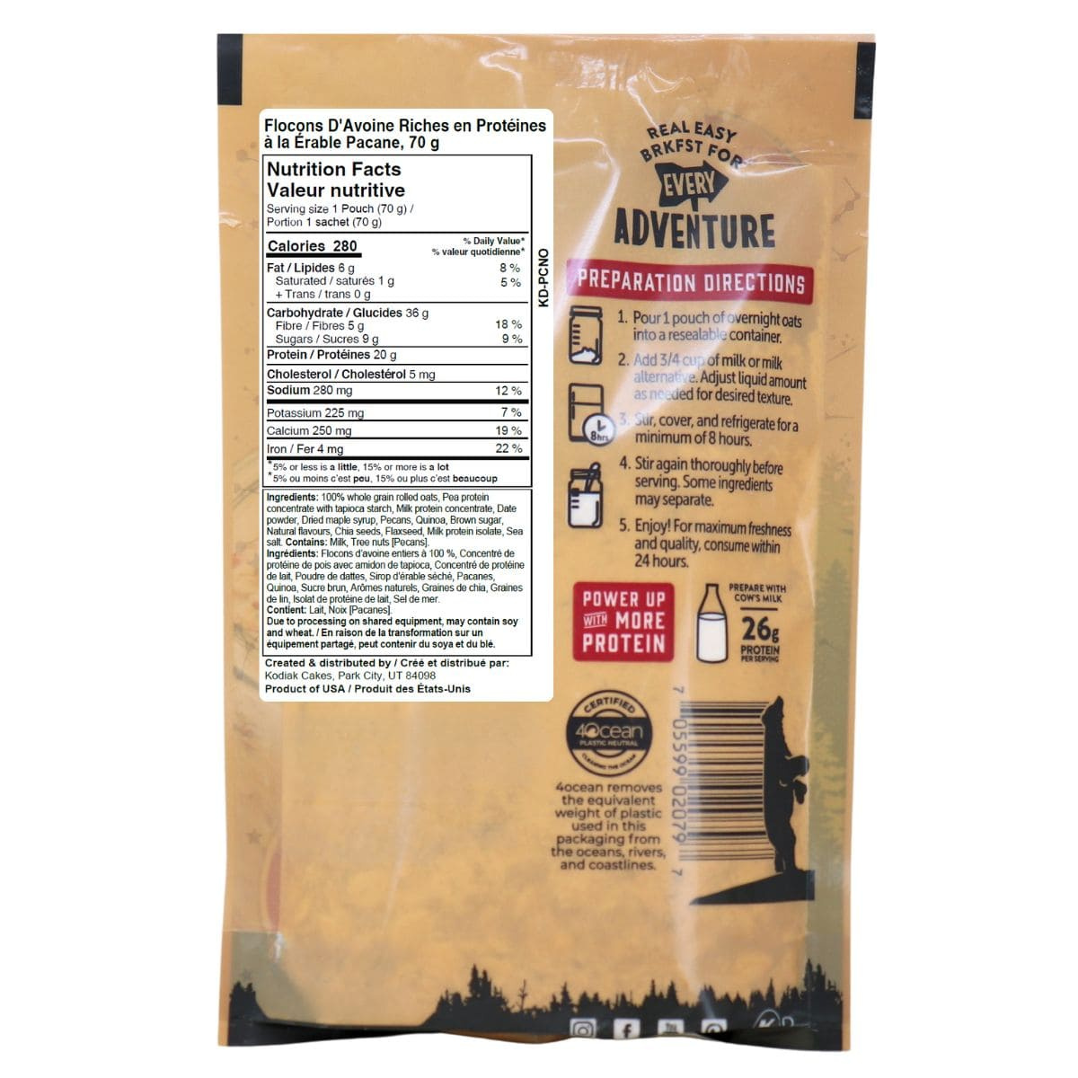 100% whole grain rolled oats, Pea protein concentrate with tapioca starch, Milk protein concentrate, Date powder, Dried maple syrup, Pecans, Quinoa, Brown sugar, Natural flavours, Chia seeds, Flaxseed, Milk protein isolate, Sea salt.