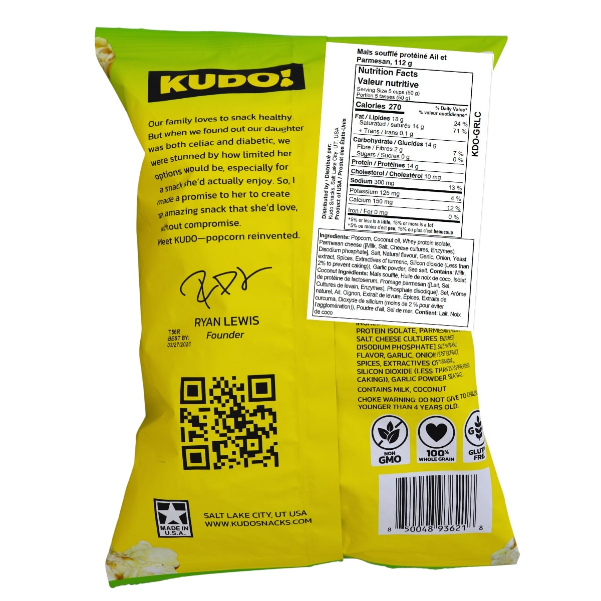 KUDO! Protein Popcorn in Garlic Parmesan takes your love of cheesy, garlicky goodness to the next level, with a satisfying crunch and a boost of protein. Every fluffy kernel is coated in real Parmesan flavour and a hint of roasted garlic for that irresistible, gourmet popcorn experience.
