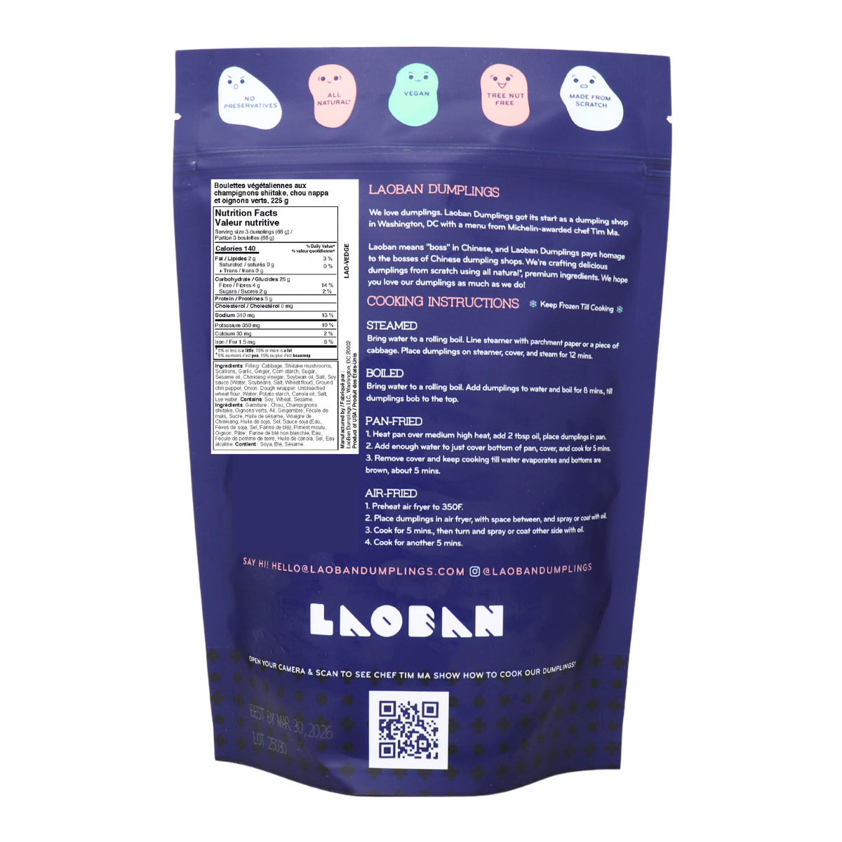 Filling: Cabbage, Shiitake mushrooms, Scallions, Garlic, Ginger, Corn starch, Sugar, Sesame oil, Chinkiang vinegar, Soybean oil, Salt, Soy sauce (Water, Soybeans, Salt, Wheat flour), Ground chili pepper, Onion. Dough wrapper: Unbleached wheat flour, Water, Potato starch, Canola oil, Salt, Lye water.