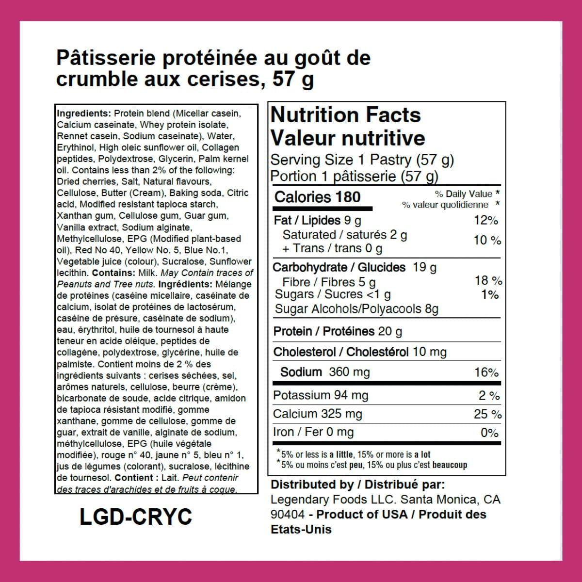 Protein blend (Micellar casein, Calcium caseinate, Whey protein isolate, Rennet casein, Sodium caseinate), Water, Erythinol, High oleic sunflower oil, Collagen peptides, Polydextrose, Glycerin, Palm kernel oil. Contains less than 2% of the following: Dried cherries, Salt, Natural flavours, Cellulose, Butter (Cream), Baking soda, Citric acid, Modified resistant tapioca starch, Xanthan gum, Cellulose gum, Guar gum, Vanilla extract, Sodium alginate, Methylcellulose, EPG (Modified plant-based oil), Red No 40, Yellow No. 5, Blue No.1, Vegetable juice (colour), Sucralose, Sunflower lecithin.Â