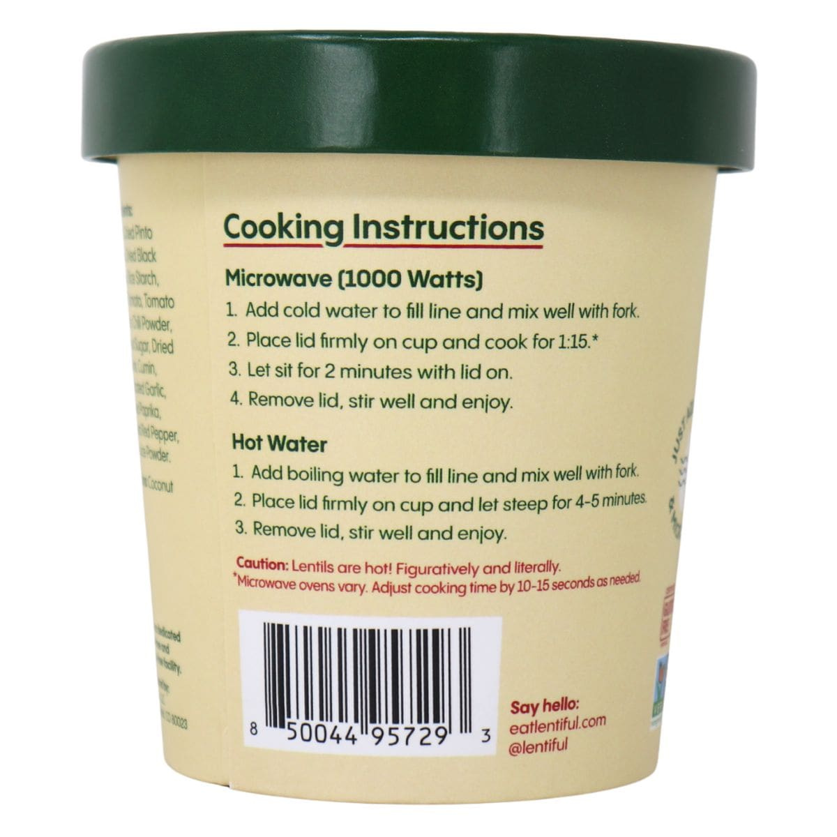 Lentils, Dried pinto beans, Dried black beans, Rice starch, Dried tomato, Tomato powder, Chili powder, Coconut sugar, Dried scallions, Cumin, Dehydrated garlic, Smoked paprika, Crushed red pepper, Lime juice powder.