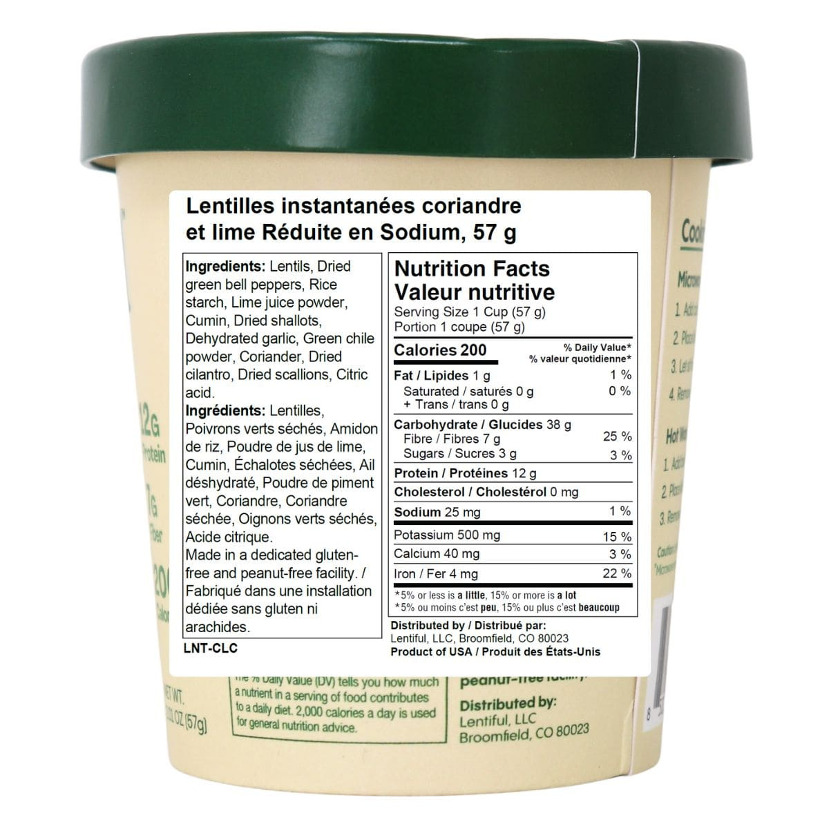 Lentiful Instant Lentils Low Sodium Cilantro Lime Chile, 57 g - Lentils, Dried green bell peppers, Rice starch, Lime juice powder, Cumin, Dried shallots, Dehydrated garlic, Green chile powder, Coriander, Dried cilantro, Dried scallions, Citric acid.