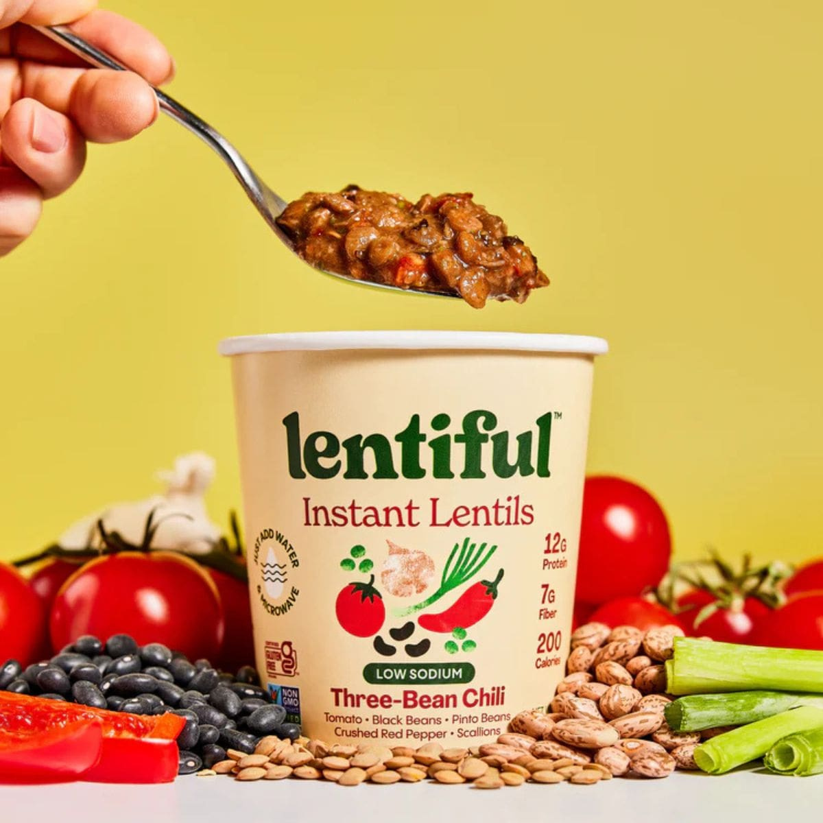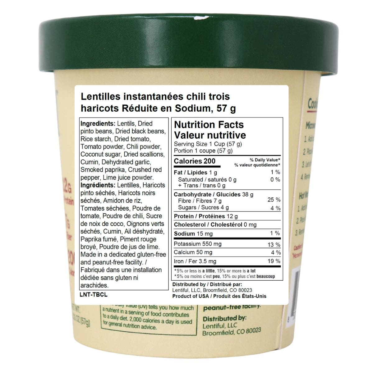 Lentiful Instant Lentils Low Sodium Three Bean Chili, 57 g - Lentils, Dried pinto beans, Dried black beans, Rice starch, Dried tomato, Tomato powder, Chili powder, Coconut sugar, Dried scallions, Cumin, Dehydrated garlic, Smoked paprika, Crushed red pepper, Lime juice powder.