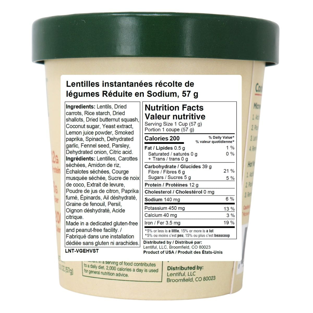 Lentiful Instant Lentils Low Sodium Vegetable Harvest, 57 g - Lentils, Dried carrots, Rice starch, Dried shallots, Dried butternut squash, Coconut sugar, Yeast extract, Lemon juice powder, Smoked paprika, Spinach, Dehydrated garlic, Fennel seed, Parsley, Dehydrated onion, Citric acid.
