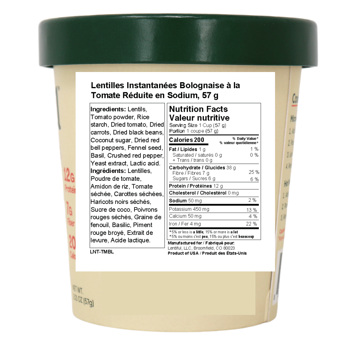 Lentiful Instant Lentils Low Sodium Tomato Bolognese, 57 g - Lentils, Tomato powder, Rice starch, Dried tomato, Dried carrots, Dried black beans, Coconut sugar, Dried red bell peppers, Fennel seed, Basil, Crushed red pepper, Yeast extract, Lactic acid.