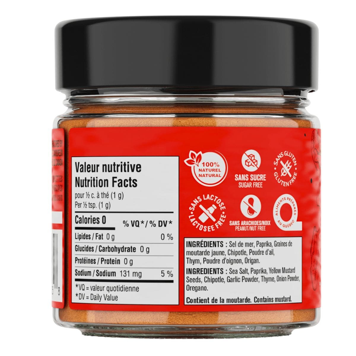 Sea Salt, Paprika, Yellow Mustard Seeds, Chipotle, Garlic Powder, Thyme, Onion Powder, Oregano.