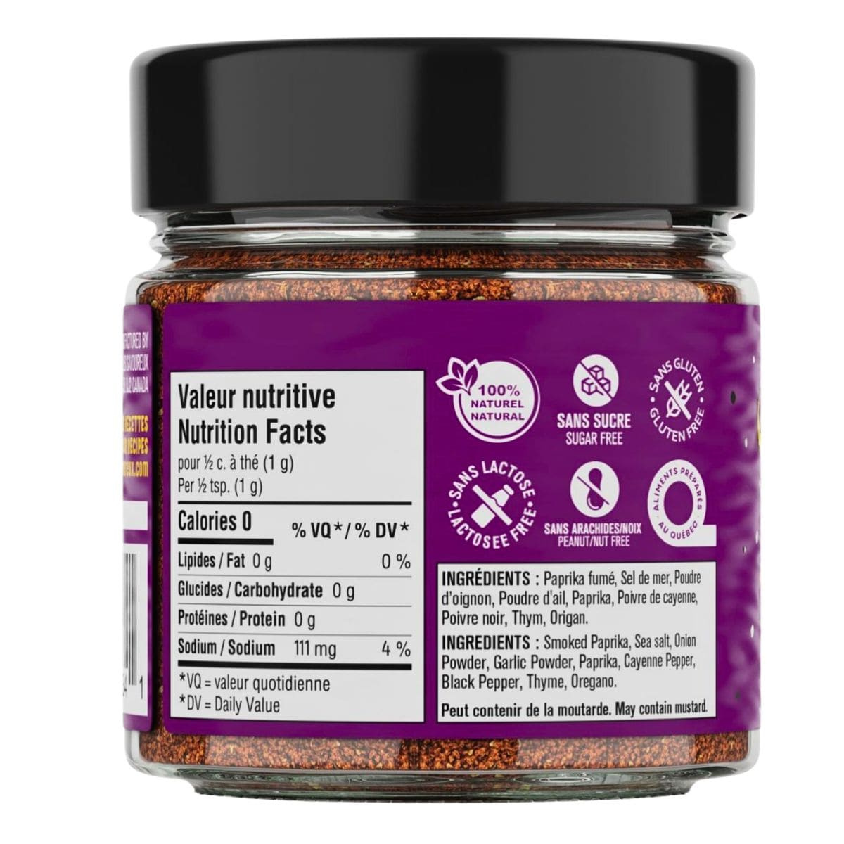 Smoked Paprika, Sea Salt, Onion Powder, Garlic Powder, Paprika, Cayenne Pepper, Black Pepper, Thyme, Oregano.