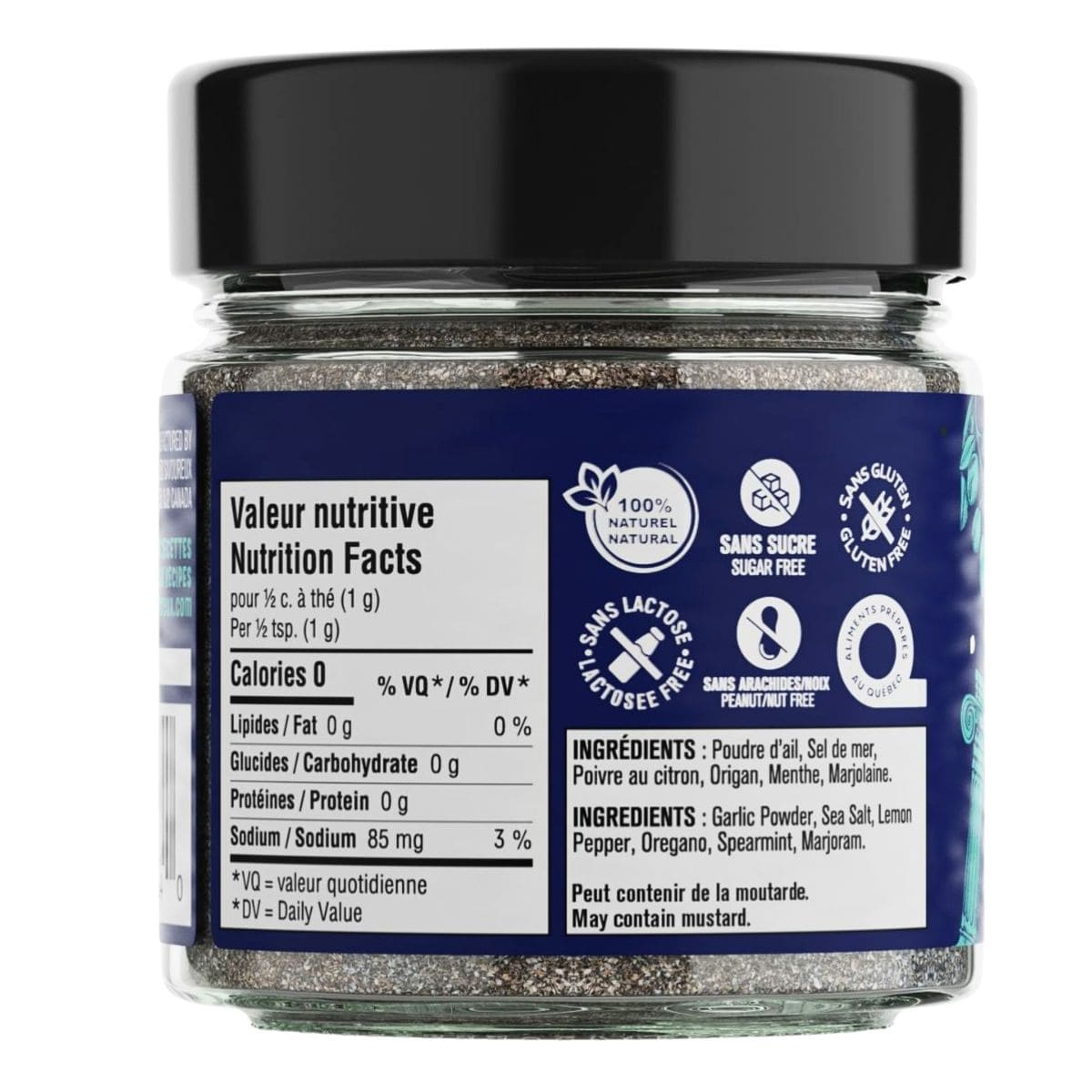 Garlic Powder, Sea Salt, Lemon Pepper, Oregano, Spearmint, Marjoram.