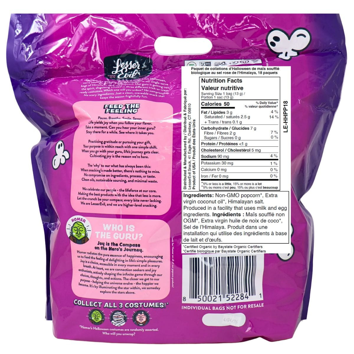 Make all the trick-or-treaters scream (with joy) when they see you handing out Lesser Evil organic popcorn! These gluten-free popcorn snack packs deliver the crunch that you crave without any of the ingredients that you don’t. Crisp and tender organic popcorn is lightly coated with premium coconut oil and seasoned with Himalayan pink salt for a spooky snack that everyone will enjoy. It's the perfect treat for Halloween - and every day!