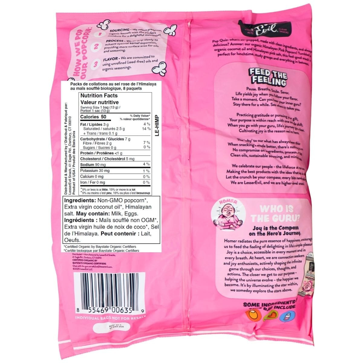 Say hello to Lesser Evil’s organic popcorn. With 8 convenient snack packs, it's the perfect back-to-school snack or busy weeknight treat. It's gluten-free, vegan, and organic! And with only three ingredients: organic popcorn, organic extra-virgin coconut oil, and Himalayan pink salt, it has minimal ingredients for maximum snackability! Light and fluffy, it’s healthy deliciousness in every bite (or handful)!