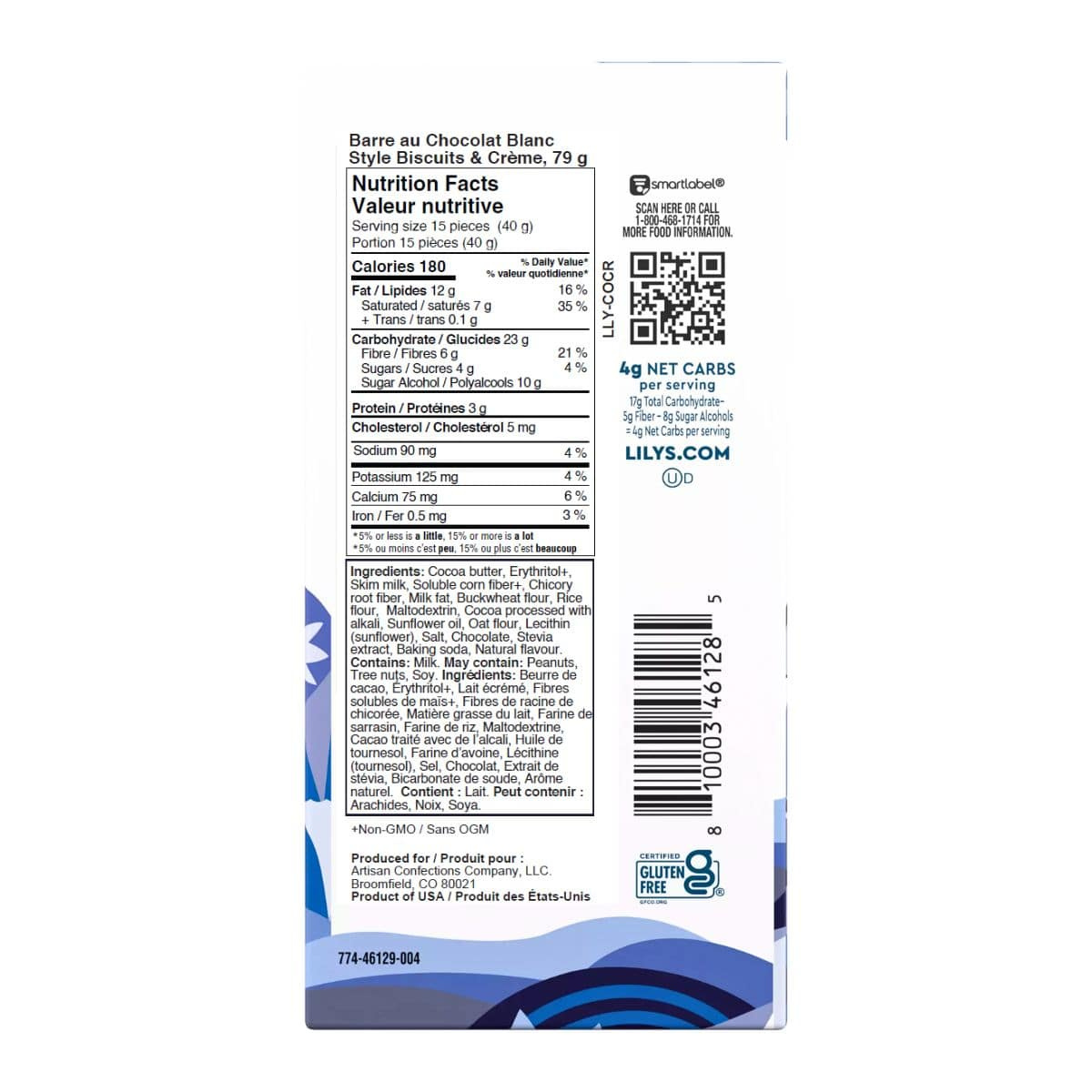 Cocoa Butter, Erythritol+, Skim Milk, Soluble Corn Fiber+, Chicory Root Fiber, Milk Fat, Buckwheat Flour, Rice Flour, Contains 2% or less of: Maltodextrin, Cocoa Processed with Alkali, Sunflower Oil, Oat Flour, Lecithin (Sunflower), Salt, Chocolate, Stevia Extract, Baking Soda, Natural Flavour.