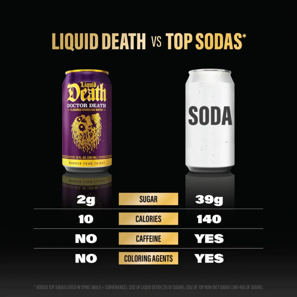 The doctor is in, and your prescription is ready! Liquid Death Sparkling Water Doctor Death drink is the sparkling water beverage that will put your raging thirst out of its misery.