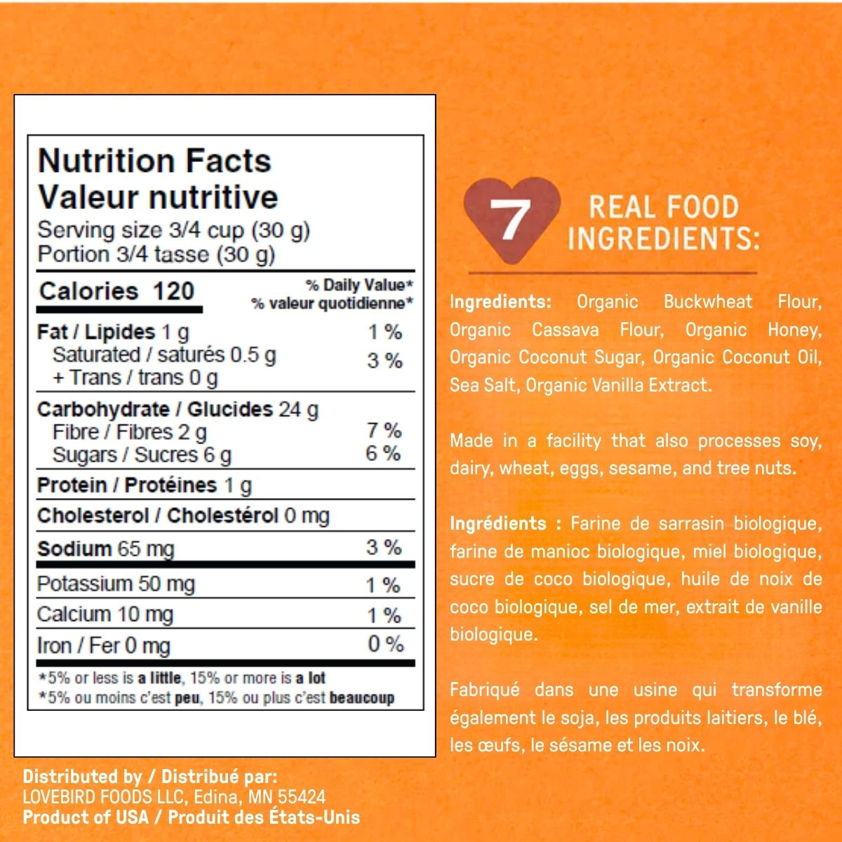 Organic Buckwheat Flour, Organic Cassava Flour, Organic Honey, Organic Coconut Sugar, Organic Coconut Oil, Sea Salt, Organic Vanilla Extract.