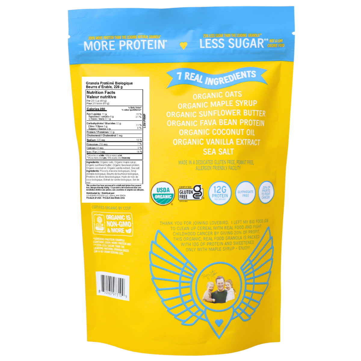 Clean. Comforting. Full of real maple syrup goodness. Lovebird Organic Protein Granola Maple Butter blends simple ingredients into a warm, lightly sweet granola that fuels your morning with real food and zero fuss. It starts with organic oats, sunflower butter, and a touch of maple syrup for that cozy flavour that feels just right any time of year.