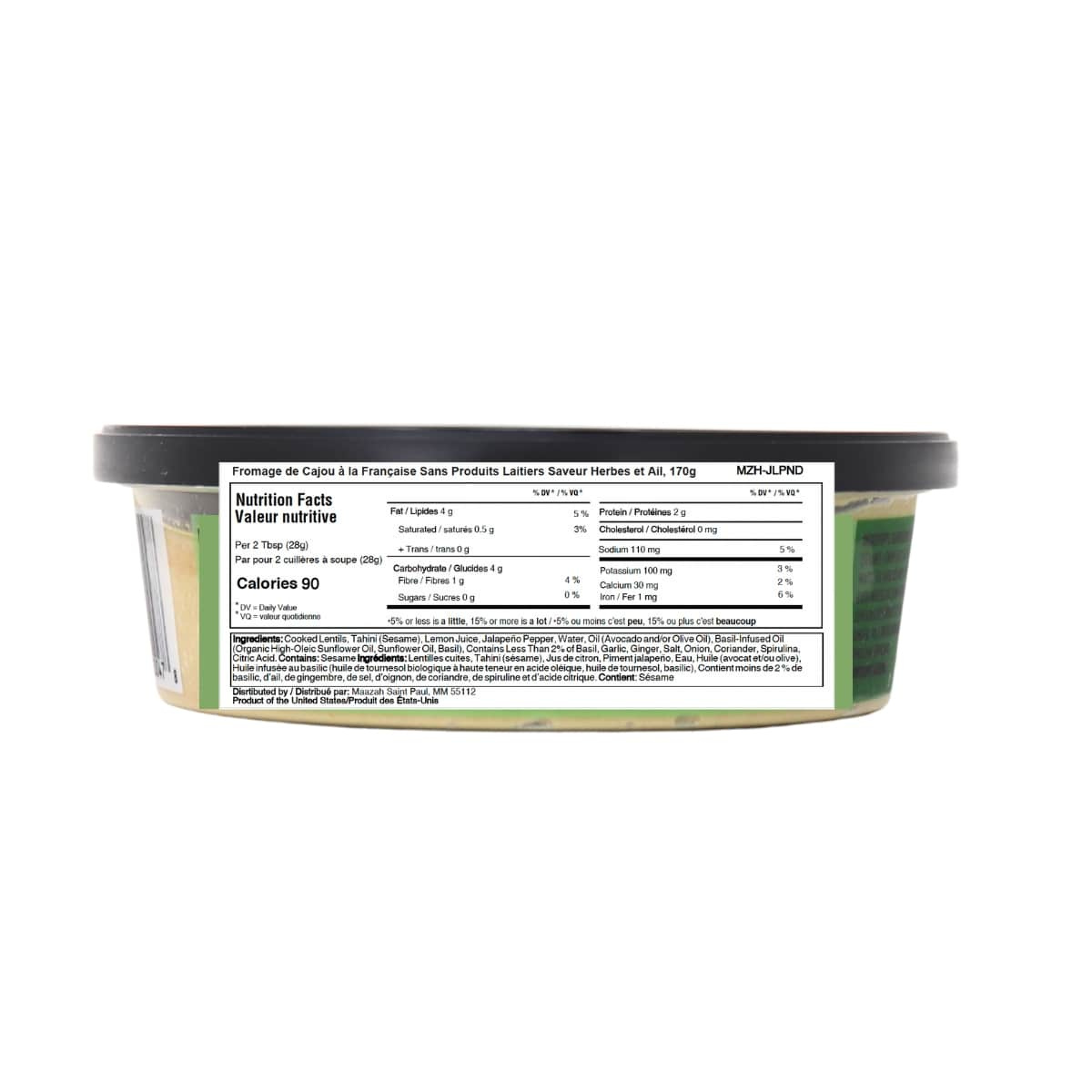 Cooked Lentils, Tahini (Sesame), Lemon Juice, Jalapeño Pepper, Water, Oil (Avocado and/or Olive Oil), Basil-Infused Oil (Organic High-Oleic Sunflower Oil, Sunflower Oil, Basil), Contains Less Than 2% of Basil, Garlic, Ginger, Salt, Onion, Coriander, Spirulina, Citric Acid.