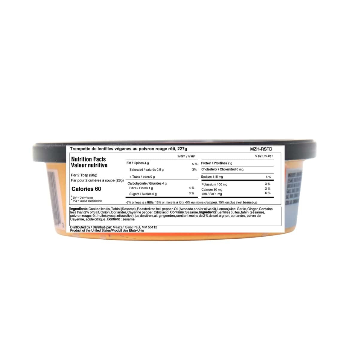 Cooked lentils, Tahini (Sesame), Roasted red bell pepper, Oil (Avocado and/or olive oil), Lemon juice, Garlic, Ginger, Contains less than 2% of Salt, Onion, Coriander, Cayenne pepper, Citric acid.