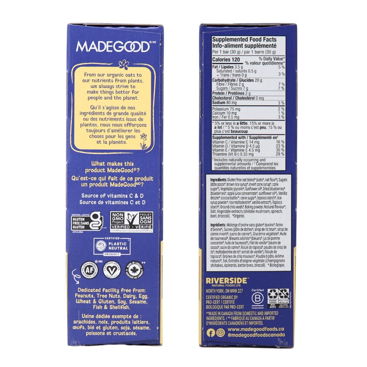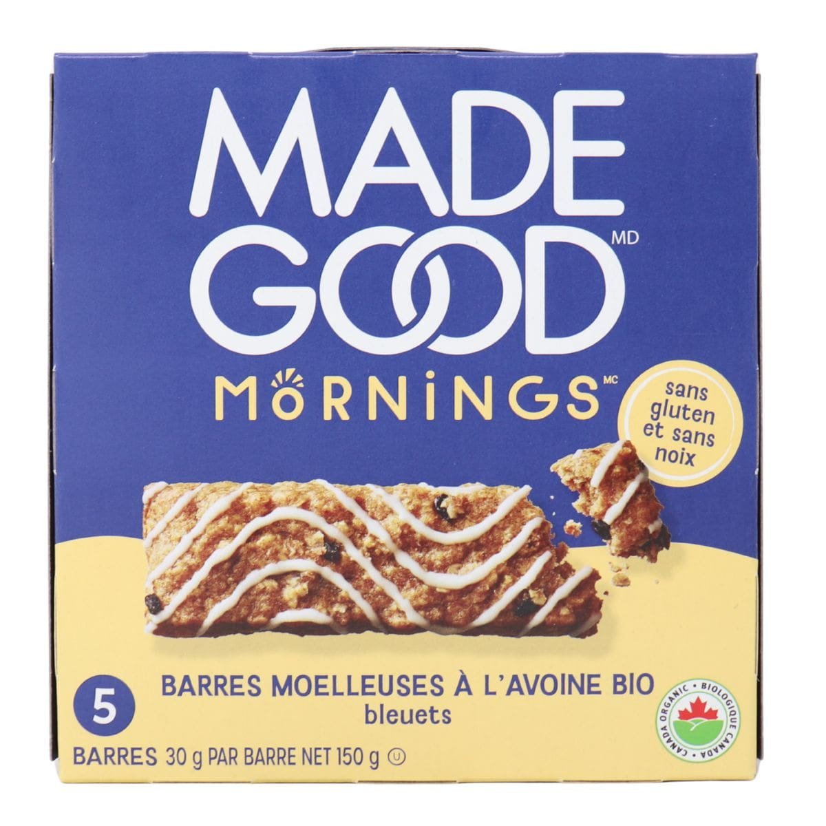 Soft, chewy, and just sweet enough. MadeGood Mornings Gluten-Free Soft-Baked Oat Bars Blueberry Flavour hits all the marks when it comes to a quick, flavourful, and on-the-go breakfast or snack. We know not everyone has time in the mornings for a nutritious and delicious breakfast, but why not bring something easy to your routine? These oat bars are gluten-free, organic, and highly satisfying. Not only are they the perfect snack for school lunches, but they are also a great little treat for that mid-day work-from-home slump. Free from common allergens, these bars are berry, berry yummy!