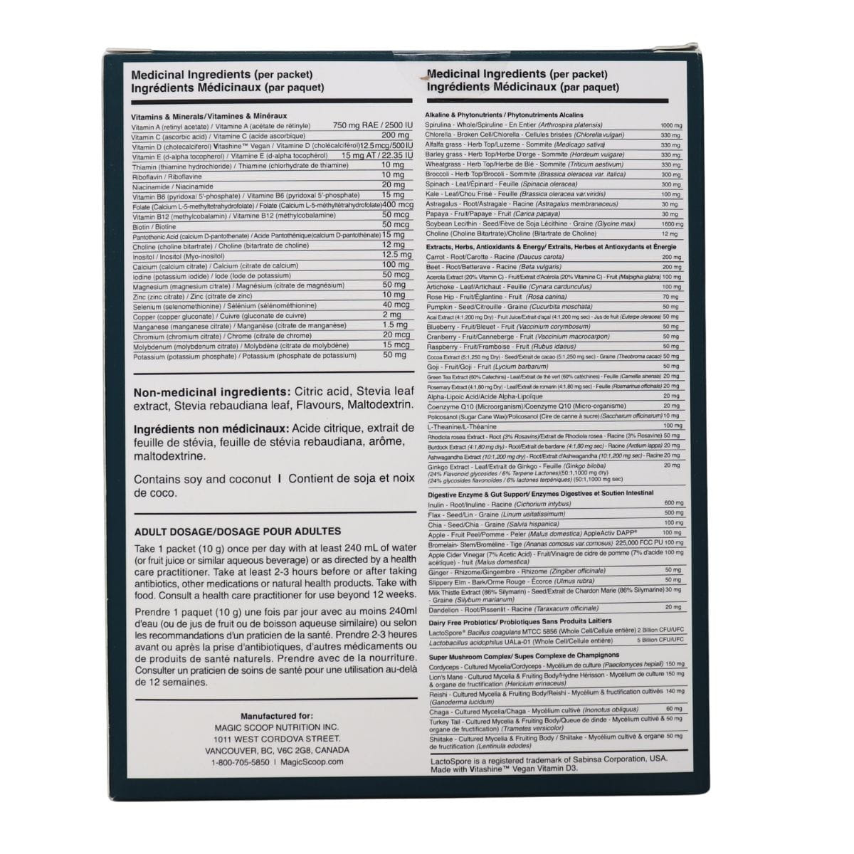 Vitamin A (retinyl acetate) 750mg RAE/2500 IU, Vitamin C (ascorbic acid) 200mg, Vitamin D (cholecalciferol) Vitashine Vegan 12.5mcg/500 IU, Vitamin E (d-alpha tocopherol) 15mg AT / 22.35 IU, Thiamin (B1) (thiamine hydrochloride) 10mg, Riboflavin (B2) 10mg, Niacinamide (B3)20mg, Vitamin B6 (pyridoxal 5-phosphate) 15mg, Folate (B9) (Calcium L-5-methyltetrahydrofolate) 400mcg, Vitamin B12 (methylcobalamin) 50mcg, Biotin 50mcg, Pantothenic Acid (B5) (calcium D-pantothenate) 15mg, Choline (choline bitrate) 12mg, Inositol 12.5mg, Calcium (calcium citrate)100mg, Iodine (potassium iodide) 50mcg, Magnesium (magnesium citrate) 50mg, Zinc (zinc citrate) 10mg, Selenium (selenomethionine) 40mcg, Copper (copper gluconate) 2mg, Manganese (manganese citrate) 1.5mg, Chromium (chromium citrate) 20mcg, Molybdenum (molybdenum) 15mcg, Potassium (potassium phosphate) 50mg, Spirulina - Whole 1000mg, Chlorella - Broken Cell 330mg, Alfalfa Grass - Herb Top 330mg, Barley Grass - Herb Top 330mg, Wheatgrass - Herb Top 330mg, Broccoli - Herb Top 300mg, Spinach - Leaf 300mg, Kale - Leaf 100mg, Astragalus - Root 30mg, Papaya - Fruit 30mg, Soybean Lecithin - Seed 1600mg, Choline (Choline Bitartrate) 12mg, Carrot - Root 2000mg, Beet - Root 2000mg, Acerola Extract (20% Vitamin C) - Fruit 100mg, Artichoke - Leaf 100mg, Rose Hip - Fruit 70mg, Pumpkin - Seed 50mg, Acai Extract (4:1, 200mg Dry) - Fruit Juice 50mg, Blueberry - Fruit 50mg, Cranberry - Fruit 50mg, Raspberry - Fruit 50mg, Cocoa Extract (5:1, 250mg Dry) - Seed 50mg, Goji - Fruit 50mg, Green Tea Extract (60% Catechins) - Leaf 20mg, Alpha-Lipoic Acid 20mg, Coenzyme Q10 (Microorganism) 20mg, Policosanol (Sugar Can Wax) 10mg, L-Theanine 100mg, Rhodiola rosea Extract - Root (3% Rosavins) 50mg, Burdock Extract (4:1, 80mg Dry) - Root 20mg, Ashwagandha Extract (10:1, 200mg Dry) - Root 20mg, Ginkgo Extract - Leaf (24% Flavonoid glycosides / 6% Terpene Lactones) (50:1, 1000mg Dry) 20mg, Inulin - Root 600mg, Flax - Seed 500mg, Chia - Seed 100mg, Apple - Fruit Peel 100mg, Bromelain - Stem (225000 FCC PU) 100mg, Apple Cider Vinegar (7% Acetic Acid) - Fruit 100mg, Ginger- Rhizome 50mg, Slippery Elm - Bark 50mg, Milk Thistle Extract (86% Silymarin) - Seed 30mg, Dandelion - Root 20mg, Bacillus Coagulans MTCC5856 (Whole Cell) 2 Billion CFU/UFC, Lactobacillus Acidophilus UALa-01 (Whole Cell) 5 Billion CFU/UFC, Cordyceps - Cultured Mycelia (Paecilomyces hepiali) 150mg, LionҒs Mane - Cultured Mycelia & Fruiting Body (Hericium erinaceus) 150mg, Reishi - Cultured Mycelia & Fruiting Body (Ganoderma lucidum) 140mg, Chaga - Cultured Mycelia (Inonotus obliquus) 60mg, Turkey Tail - Cultured Mycelia & Fruiting Body (Trametes versicolor) 50mg, Shiitake - Cultured Mycelia & Fruiting Body (Lentinula edodes) 50mg, Citric acid, Stevia leaf extract, Stevia rebaudiana leaf, Flavours, Maltodextrin.