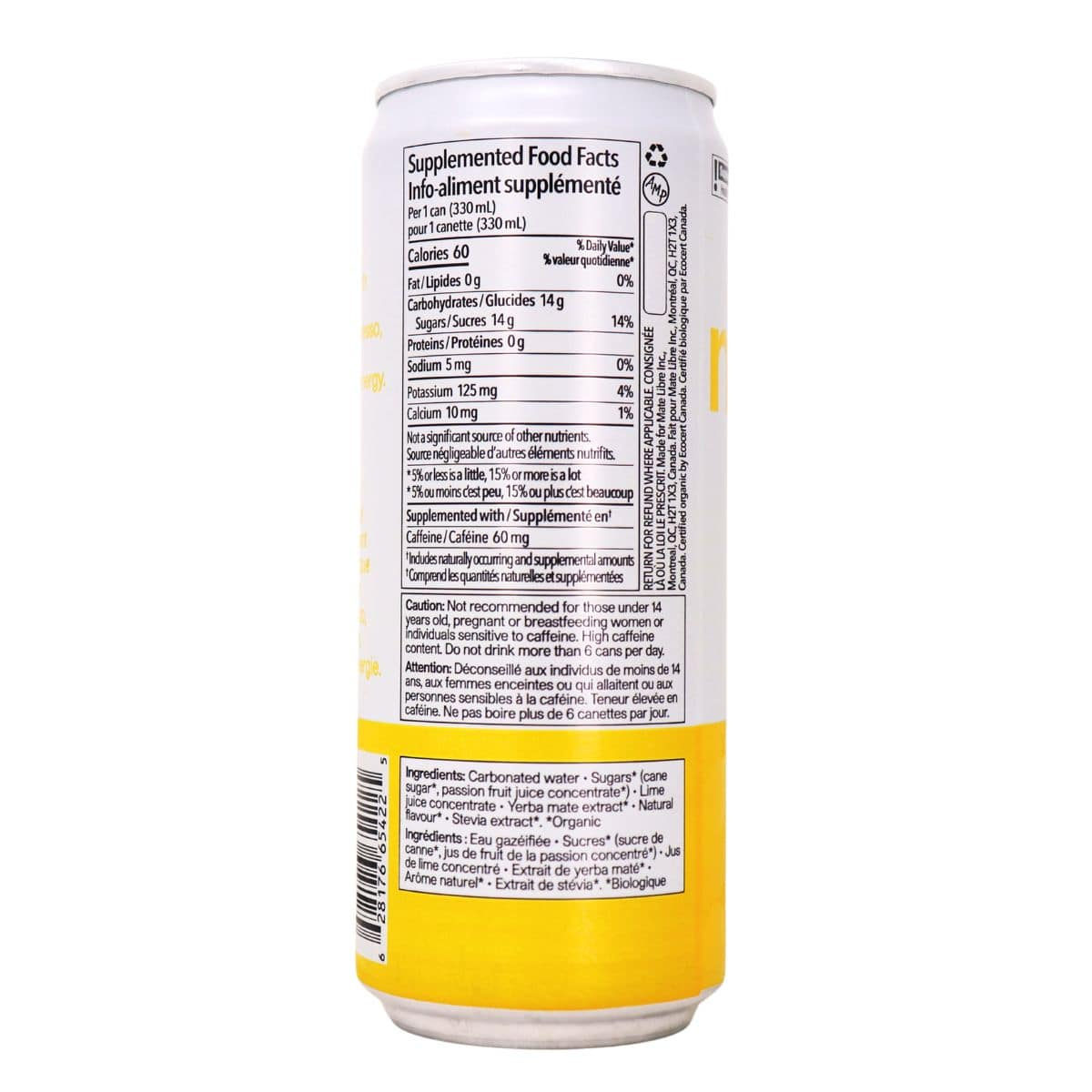 Carbonated water, Sugars* (Cane sugar*, passion fruit juice concentrate*), Lime juice concentrate*, Yerba mate extract*, Natural flavour*, Stevia extract*.