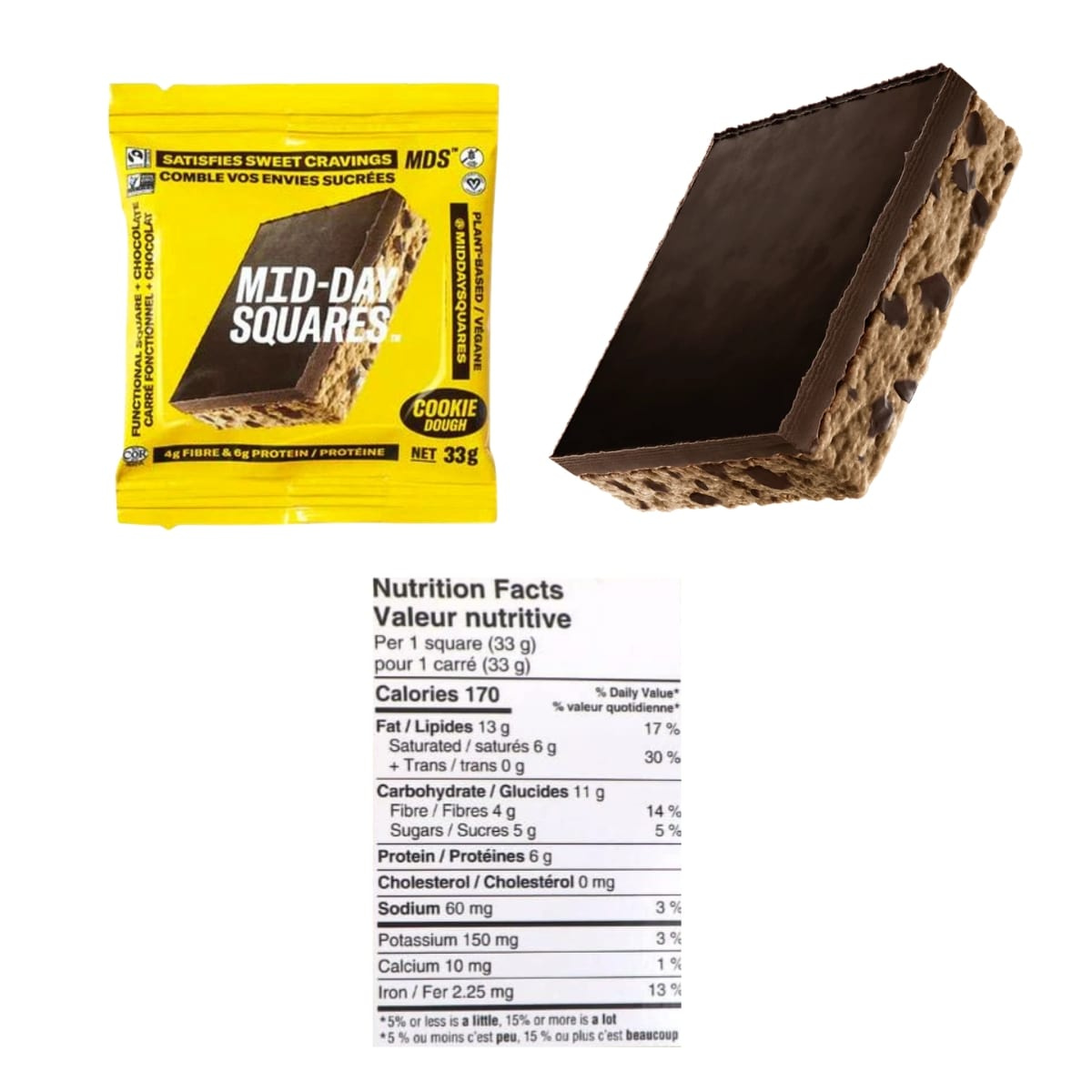 Mid-Day Squares Functional Vegan Chocolate Bar Cookie Dough - Dark chocolate (Fairtrade cocoa butter, Fairtrade cocoa powder, organic coconut sugar, salt), Organic sugars (organic maple syrup, organic apple juice concentrate, organic tapioca syrup, organic coconut sugar, organic molasses), Organic fava bean protein, Fairtrade cocoa butter, Olive oil, Organic Jerusalem artichoke powder, Organic carob protein, Organic cashew butter, Fairtrade cocoa powder, Vanilla extract, Salt, Organic apple cider vinegar, Water, Organic rice bran extract, organic okra powder. Contains: Cashews. May contain: Almonds, Hazelnuts, Peanuts, and Sesame.