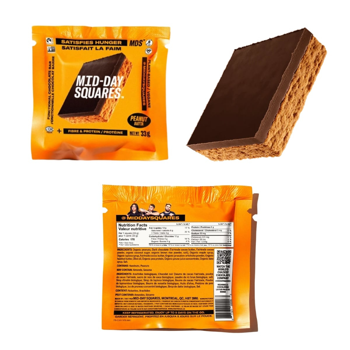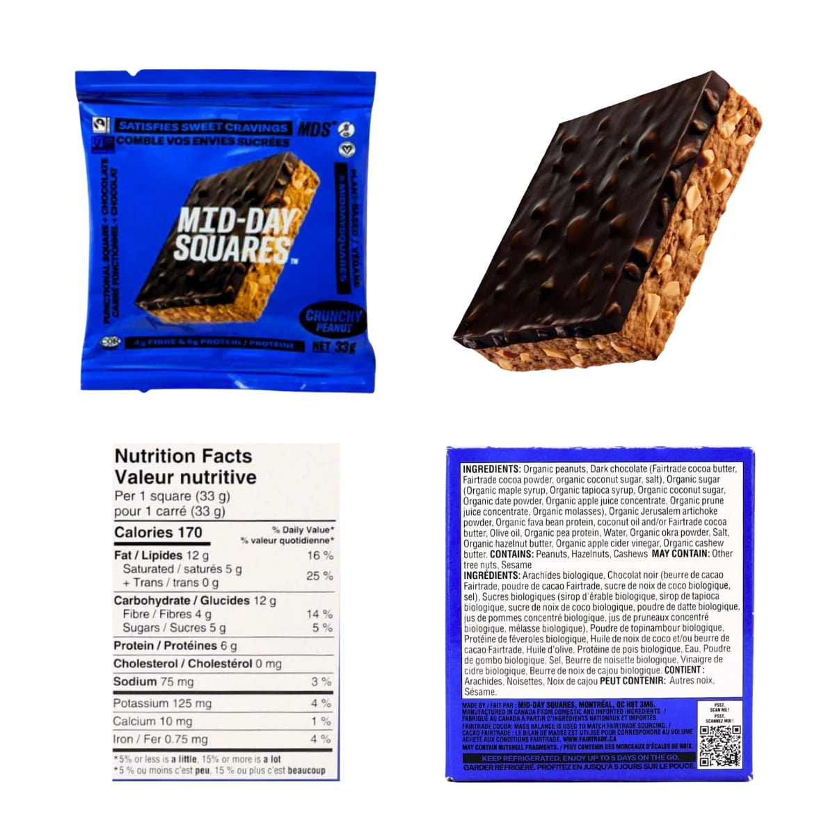 Mid-Day Squares Vegan Functional Chocolate Bar Crunchy Peanut - Organic peanuts, Dark chocolate (Fairtrade cocoa butter, Fairtrade cocoa powder, organic coconut sugar, salt), Organic sugar (Organic maple syrup, Organic tapioca syrup, Organic coconut sugar, Organic date powder, Organic apple juice concentrate, Organic prune juice concentrate, Organic molasses), Organic Jerusalem artichoke powder, Organic fava bean protein, coconut oil and/or Fairtrade cocoa butter, Olive oil, Organic pea protein, Water, Organic okra powder, Salt, Organic hazelnut butter, Organic apple cider vinegar, Organic cashew butter. Contains: Peanuts, Hazelnuts, Cashews