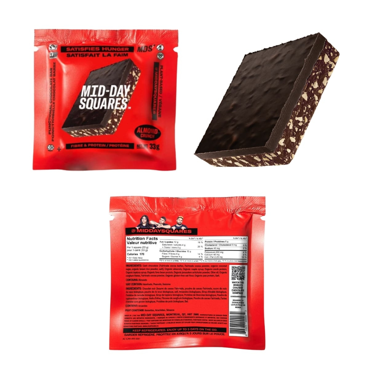 Mid-Day Squares Functional Vegan Chocolate Bar Almond Crunch - Dark Chocolate (Fairtrade Cocoa Butter, Fairtrade Cocoa Powder, Organic Coconut Sugar, Organic Brown Rice Powder, Salt), Organic Almonds, Organic Maple Syrup, Organic Carob Protein, Organic Tapioca Syrup, Organic Fava Bean Protein, Organic Jerusalem Artichoke Powder, Olive Oil, Organic Sorghum Flakes, Fairtrade Cocoa Powder, Organic Gluten-Free Oat Flour, Organic Pea Protein, Salt. *Organic. Contains Tree nuts [Almonds]. May Contain: Peanuts, Tree Nuts (Hazelnuts), Sesame.