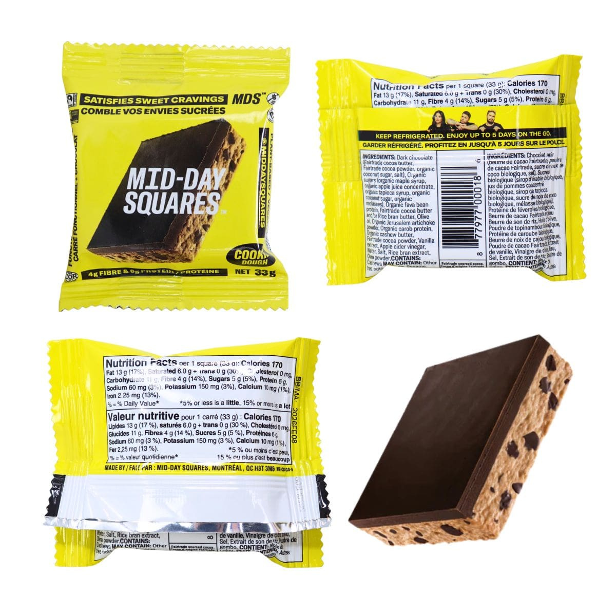 Mid-Day Squares Functional Vegan Chocolate Bar Cookie Dough - Dark chocolate (Fairtrade cocoa butter, Fairtrade cocoa powder, organic coconut sugar, salt), Organic sugars (organic maple syrup, organic apple juice concentrate, organic tapioca syrup, organic coconut sugar, organic molasses), Organic fava bean protein, Fairtrade cocoa butter and/or Rice Bran Butter, Olive oil, Organic Jerusalem artichoke powder, Organic carob protein, Organic cashew butter, Fairtrade cocoa powder, Vanilla extract, Apple cider vinegar, Water, Salt, Rice bran extract, Okra powder. Contains: Cashews. May contain: Other tree nuts, Peanuts, and Sesame.