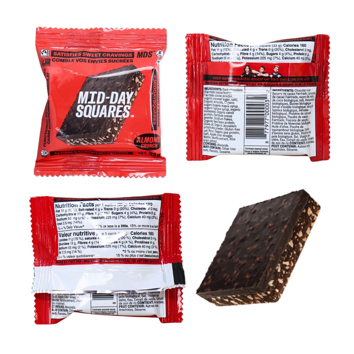 Mid-Day Squares Functional Vegan Chocolate Bar Almond Crunch - Dark Chocolate (Fairtrade Cocoa Butter, Fairtrade Cocoa Powder, Organic Coconut Sugar, Salt), Organic Almonds, Organic Sugars (Organic Maple Syrup, Organic Tapioca Syrup, Organic Molasses), Organic Carob Protein, Fairtrade Cocoa Powder, Sorghum Flakes, Organic Fava Bean Protein, Olive Oil, Organic Jerusalem Artichoke Powder, Gluten-Free Oat Flour, Organic Pea Protein, Salt, Apple Cider Vinegar, Water, Vanilla Extract, Rice Bran Extract. Contains: Almonds. MAY CONTAIN: Other tree nuts, Peanuts, Sesame.