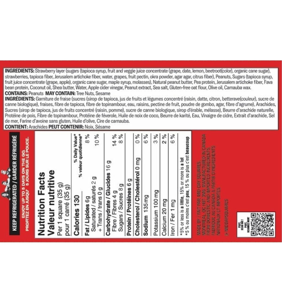 Strawberry layer (Sugars (Tapioca syrup, fruit and veggie juice concentrate (Grape, date, lemon, beetroot (Color), organic cane sugar), Strawberries, tapioca fiber, Jerusalem artichoke fiber, water, fruit pectin, okra powder, agar agar, citrus fiber)), Peanuts, Sugars (Tapioca syrup, fruit juice concentrate (Grape, apple), organic cane sugar, maple syrup, molasses), Natural peanut butter, Pea protein, Jerusalem artichoke fiber, Fava bean protein, Coconut oil, Shea butter, Water, Apple cider vinegar, Peanut extract, Sea salt, Gluten free oat flour, Olive oil, Carnauba wax.Â
