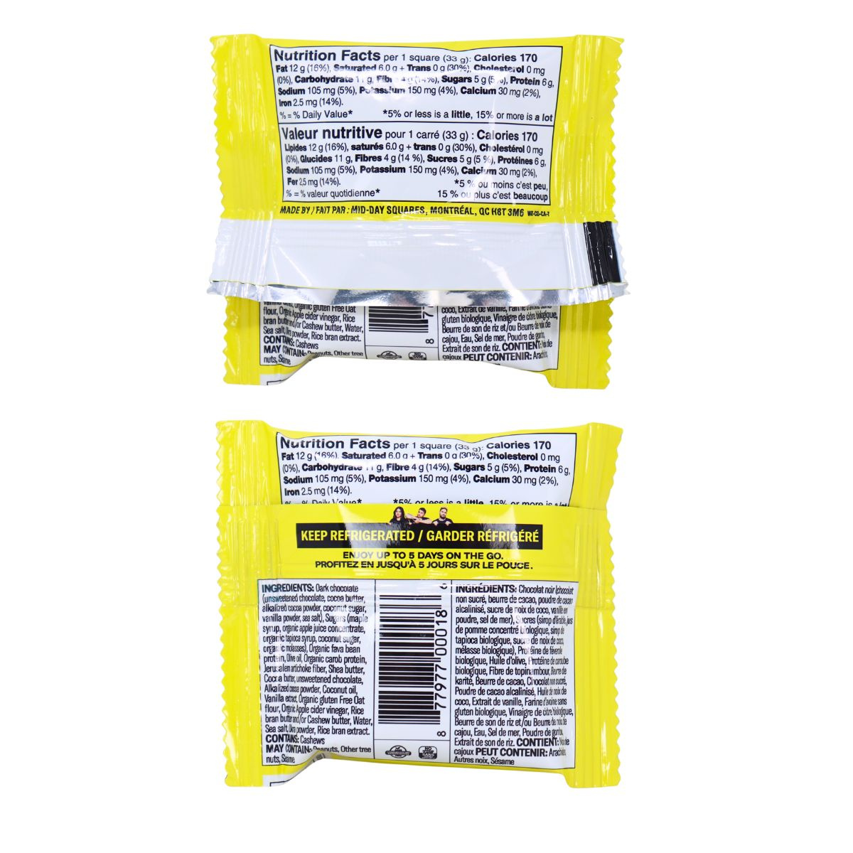 From the manufacturer: Since we don’t use any preservatives or processed ingredients, refrigeration is required to maintain the optimal freshness, consistency, texture, shape, and flavor. However, Mid-Day Squares can last for at least 5 days outside the fridge and actually taste better at room temperature!