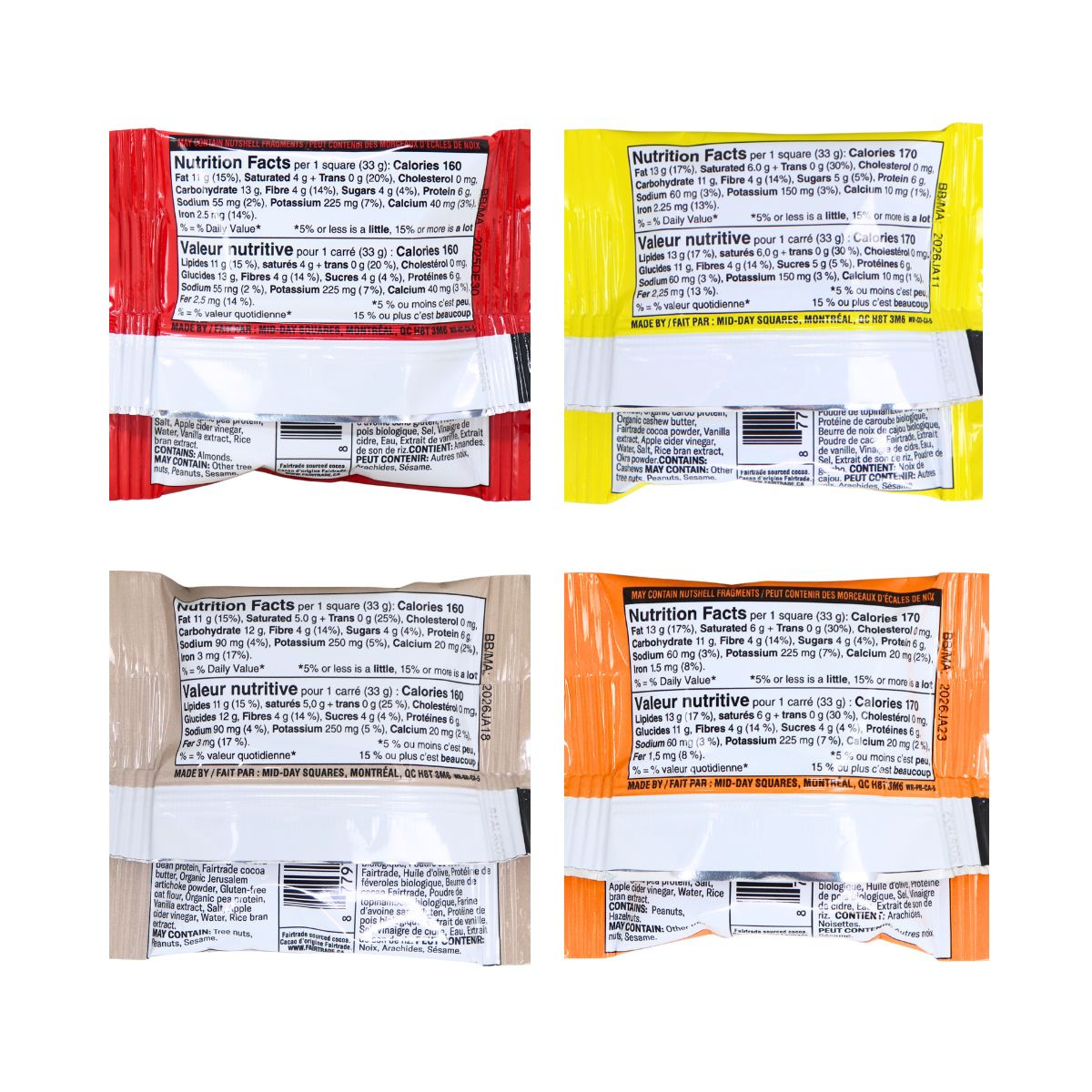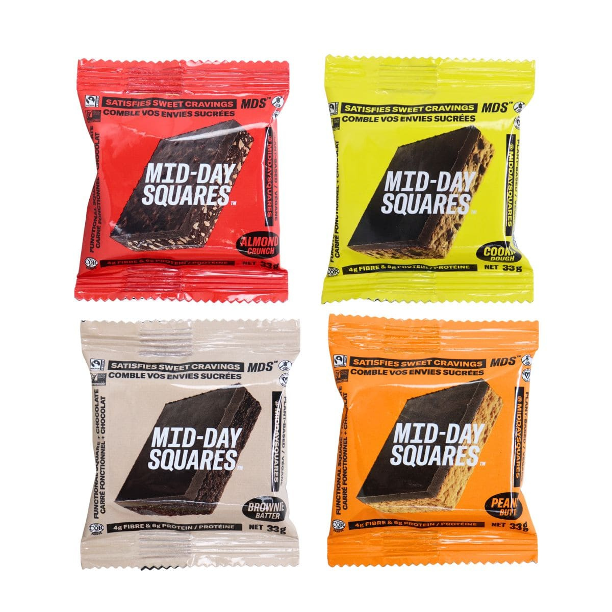 Introducing the Mid-Day Square's functional chocolate bar variety pack, the snack that's about to revolutionize your midday munchies game! With four irresistible flavours to choose from, including Brownie Batter, Almond Crunch, Peanut Butta, and Cookie Dough, you'll never have to settle for the same old snack again.